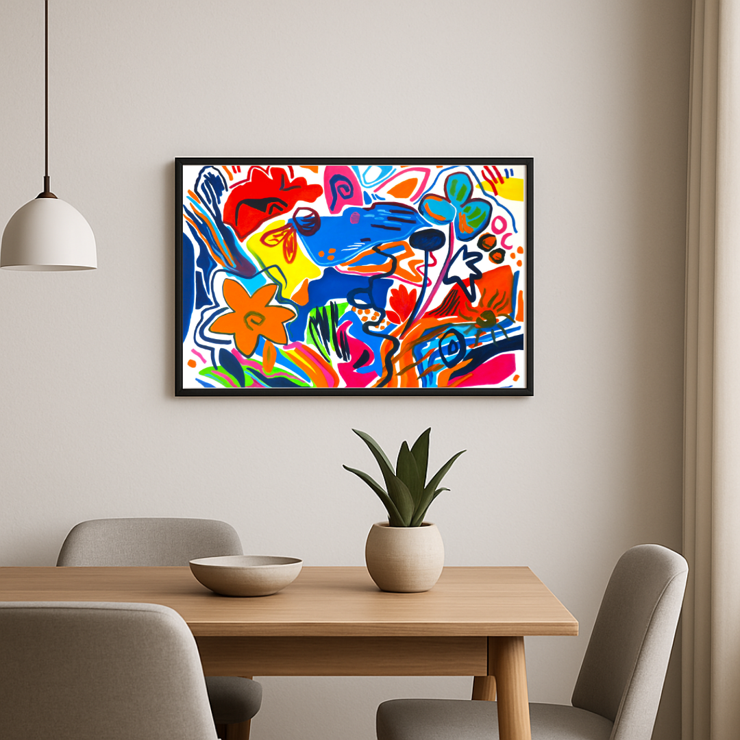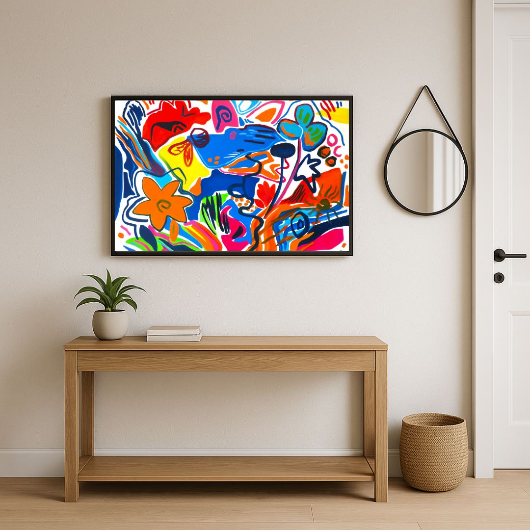 Explosion de couleurs, rythme visuel effervescent, formes libres et organiques : « Ambiance » est une célébration vibrante de la spontanéité et de l’énergie. Cette œuvre abstraite en acrylique libère une force expressive à travers un enchevêtrement joyeux de lignes, de fleurs stylisées et de motifs symboliques. Chaque élément semble surgir dans un mouvement libre, comme une musique visuelle qui pulse au gré des émotions.