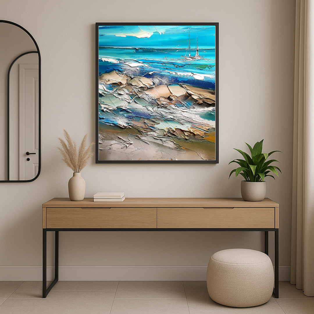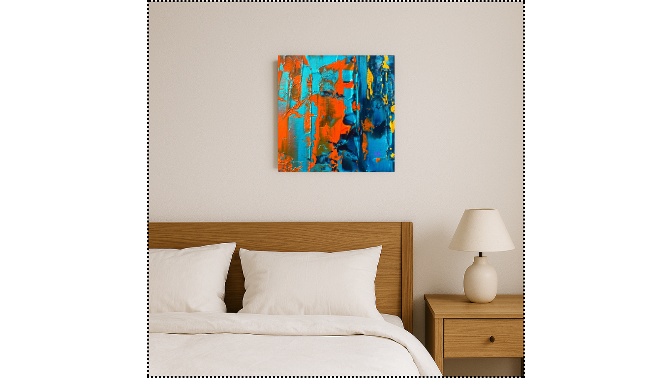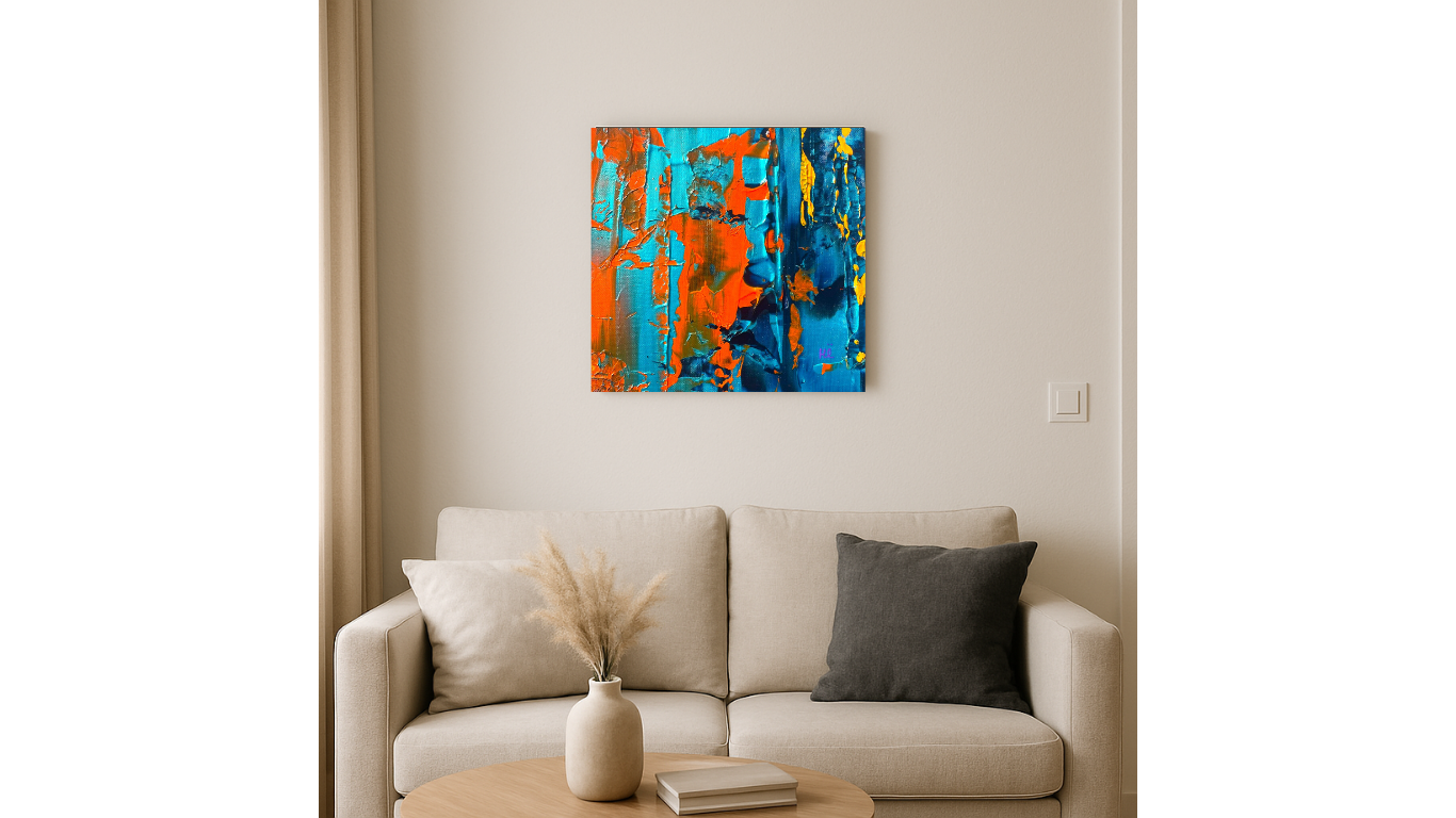 Cette œuvre contemporaine, collée sur carton dur, dévoile une composition abstraite puissante où les tons turquoise, orange et or se rencontrent dans une harmonie vibrante. Les effets de matière et de relief, travaillés au couteau, suggèrent une véritable architecture picturale, entre énergie et silence intérieur.