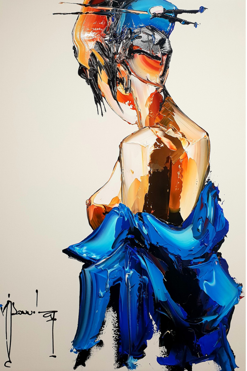 Ses créations, souvent réalisées sur grand format, sont pensées comme des articles uniques, où chaque part de couleur vient dialoguer avec l’ensemble. L’usage du couteau, qu’il manie avec une assurance remarquable, donne à ses tableaux une énergie singulière, presque sculpturale, où chevalet se croisent et où les formes semblent choisies avec soin pour composer une harmonie visuelle.