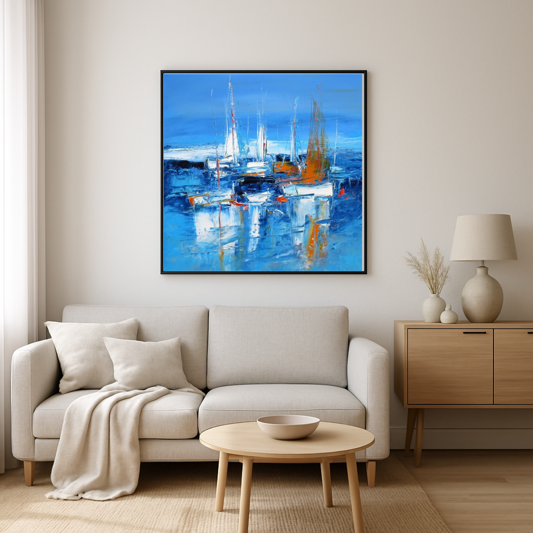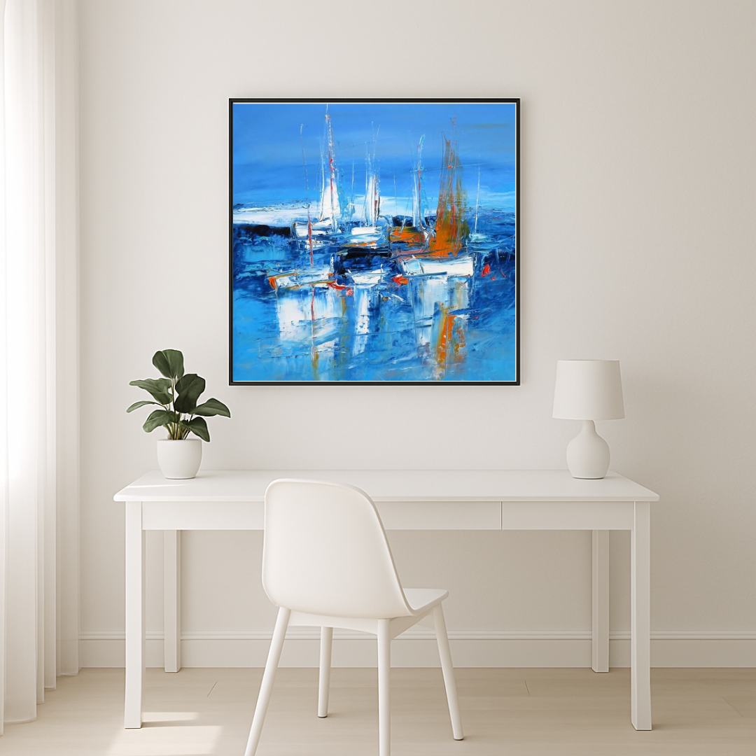 Dans cette scène marine énergique et contemporaine, Michaël Lefèvre explore les jeux de lumière et de matière au couteau. Sur un fond de bleus profonds, une flottille de bateaux se détache avec force, baignée dans une ambiance vibrante et lumineuse. Les touches d’orange, de blanc et de rouge réchauffent la composition et suggèrent des voiles en mouvement, des reflets éclatants ou encore la chaleur d’un port au petit matin.