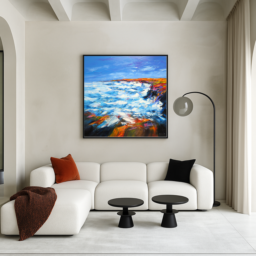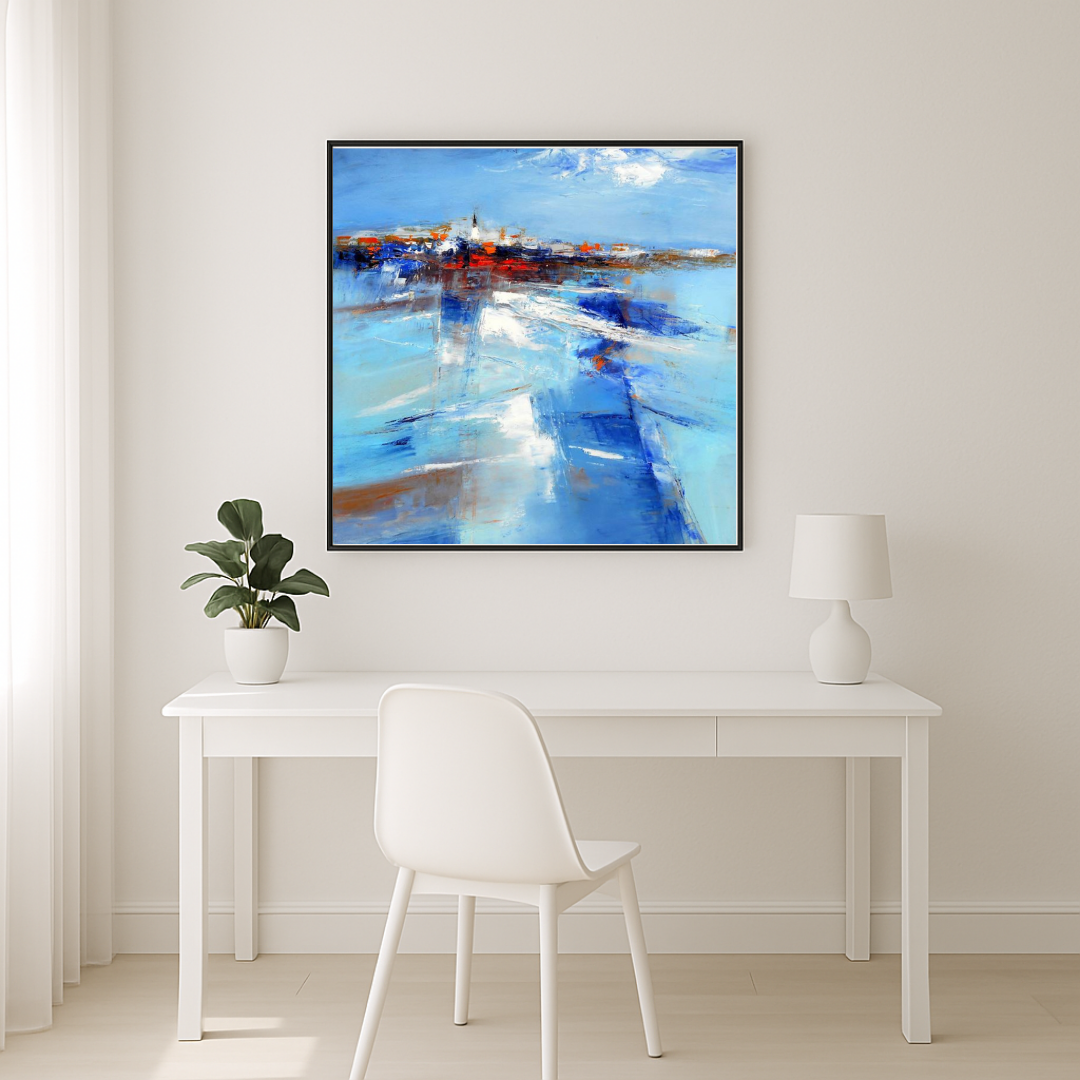 Cette scène marine contemporaine apportera une touche de fraîcheur et d’évasion à tout intérieur, en évoquant la liberté et la sérénité du large.