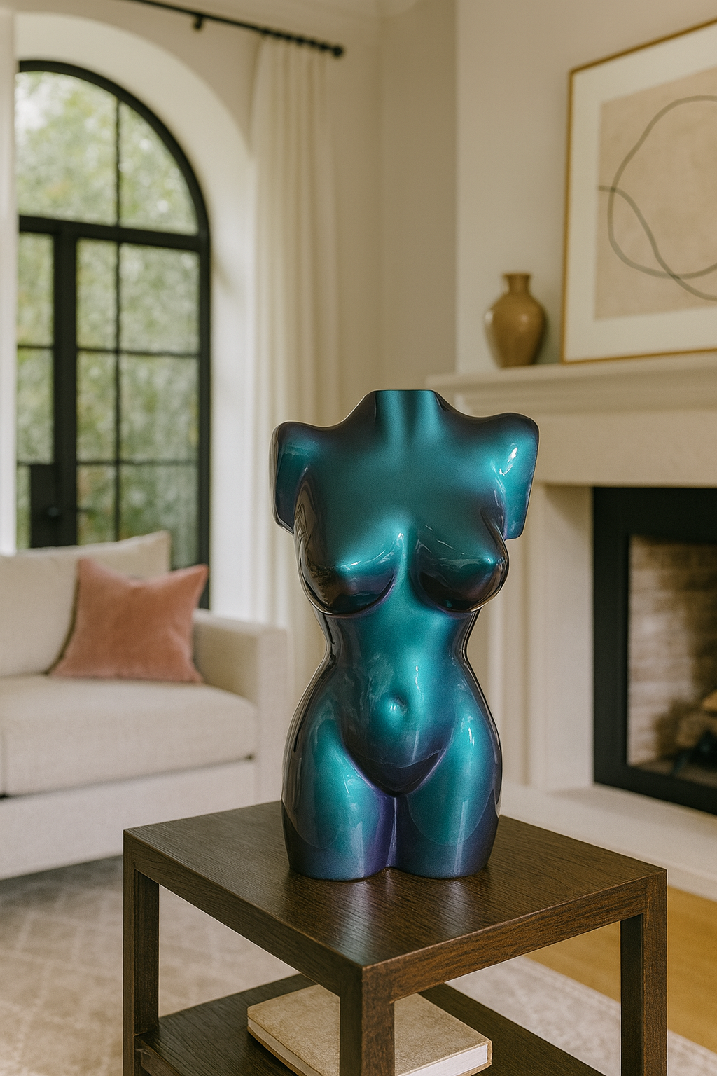 Cette sculpture contemporaine en résine, réalisée par l’artiste brésilien Paulo Brito-Tavares (PBT), incarne à la fois force et sensualité. Le travail de l’artiste met en valeur la beauté intemporelle du corps féminin, sublimée par un fini unique Caméléon, qui apporte profondeur et élégance à la pièce.