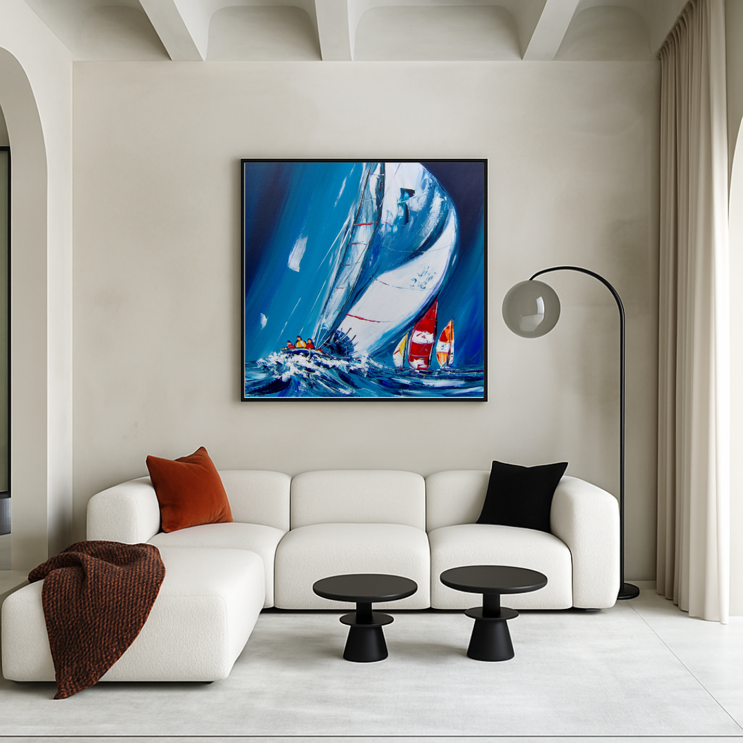 Le contraste entre le bleu profond du matériau et les lignes blanches crée un effet visuel vibrant, jouant avec la lumière et la perspective. Les courbes sont sublimées par le rythme des rayures, donnant à la pièce une allure à la fois maritime, chic et résolument contemporaine.