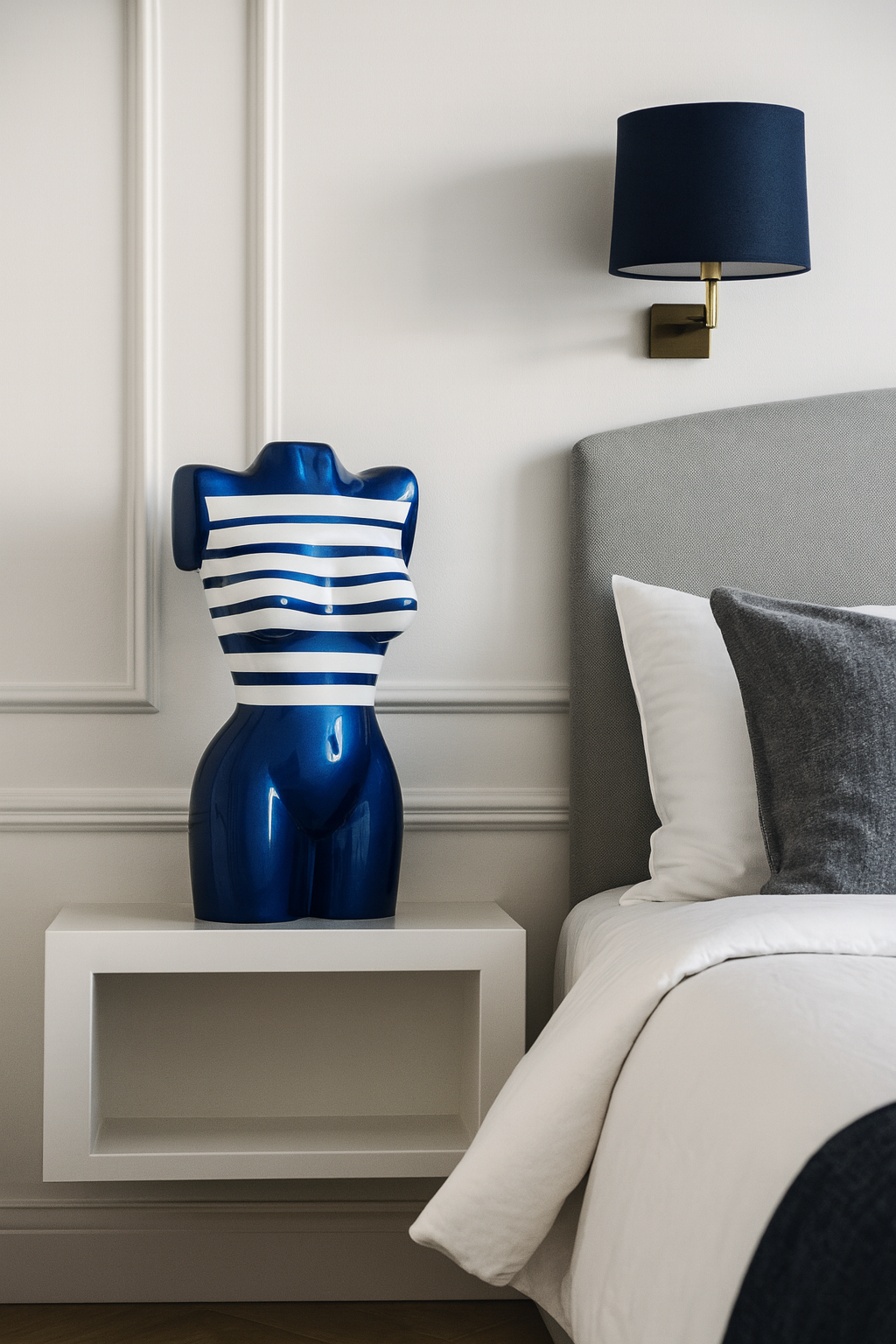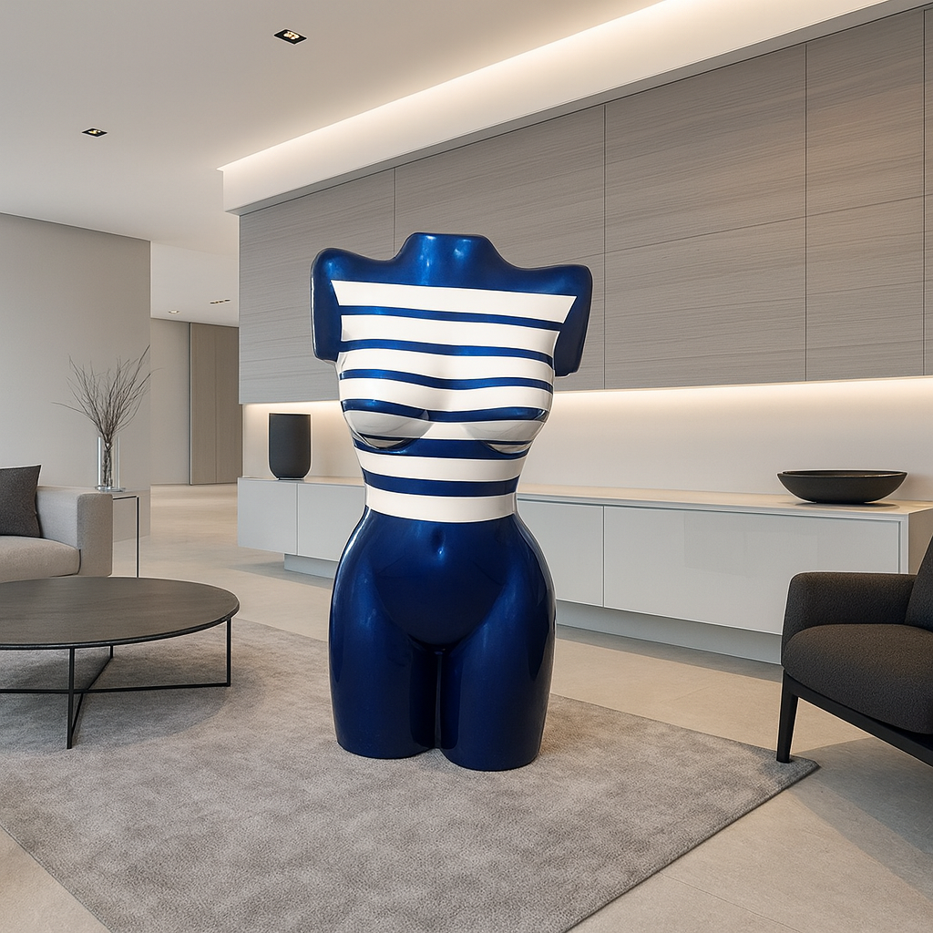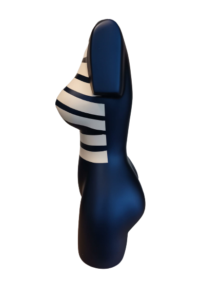 Cette sculpture signée Paulo Brito Tavares (PBT) rend un hommage audacieux à l’univers iconique de Jean Paul Gaultier. Inspirée par la fameuse marinière du couturier, elle revisite le corps féminin avec une sensualité assumée et un sens aigu du design. D’une hauteur de 75 cm, pour 37 cm de largeur et 30 cm d’épaisseur, ce buste de 9 kg attire immédiatement le regard par la tension harmonieuse entre ses formes voluptueuses et la rigueur graphique de ses bandes horizontales.