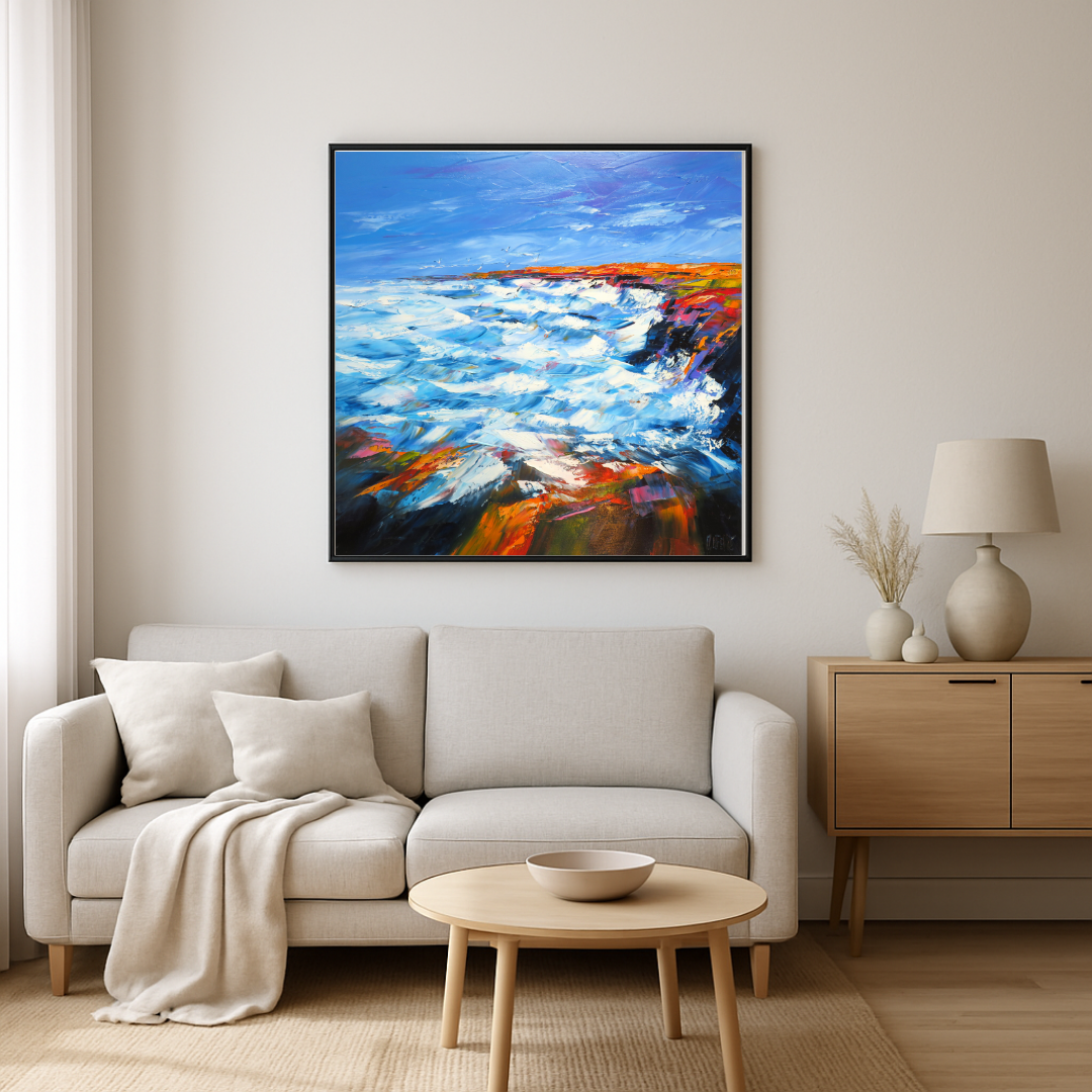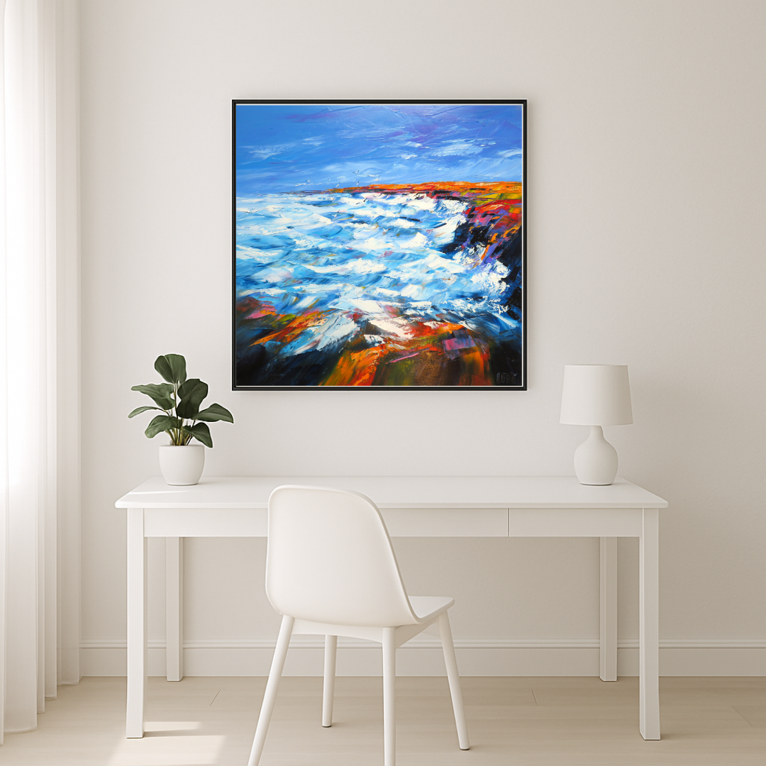 L’œuvre offre une texture dynamique et expressive, soulignant la brutalité des éléments naturels autant que leur beauté sauvage. Par son intensité chromatique et sa force évocatrice, cette scène de nature indomptée invite à ressentir la liberté, le vent salé et le tumulte de la mer. Une pièce idéale pour insuffler du caractère et du mouvement à tout espace intérieur.