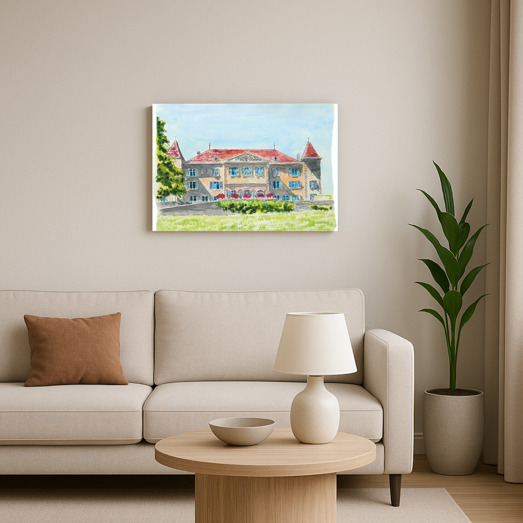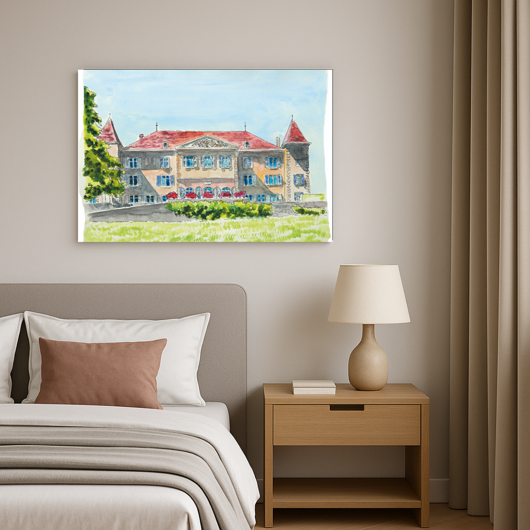 Au centre de l’œuvre se dresse le château de Dardagny, reconnaissable à ses tours et à sa façade élégante aux toits rouges, symbole d’histoire et de tradition. Les détails précis des fenêtres, les jeux d’ombre sur les murs et les touches de couleur des fleurs apportent une dimension vivante et chaleureuse à la scène. Le ciel clair et la végétation environnante, rendus avec la transparence caractéristique de l’aquarelle, confèrent à l’ensemble une atmosphère paisible et accueillante.