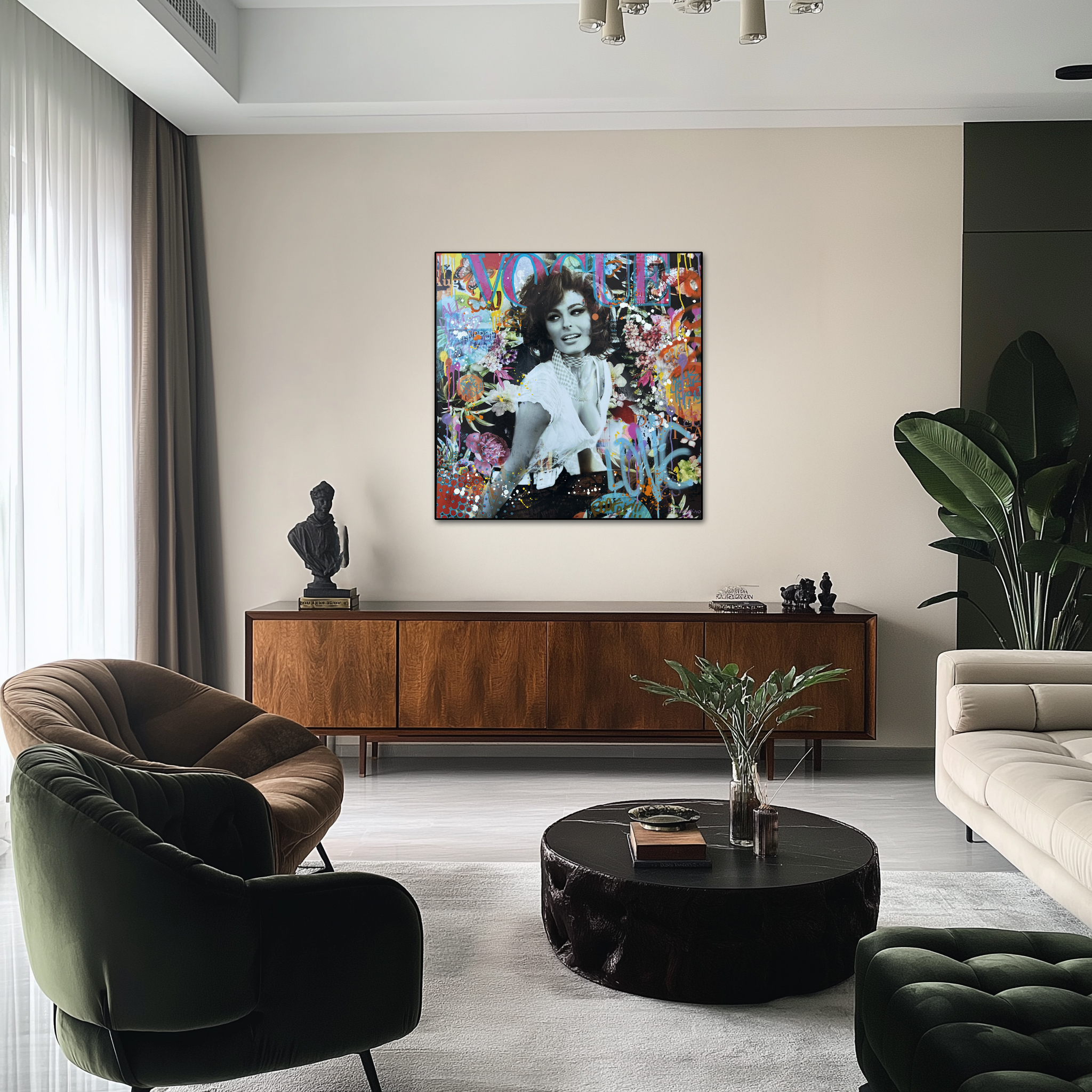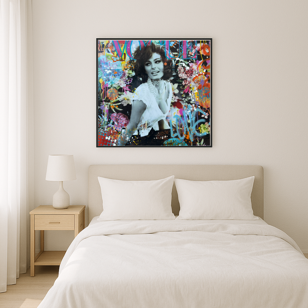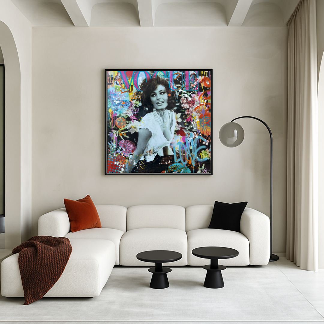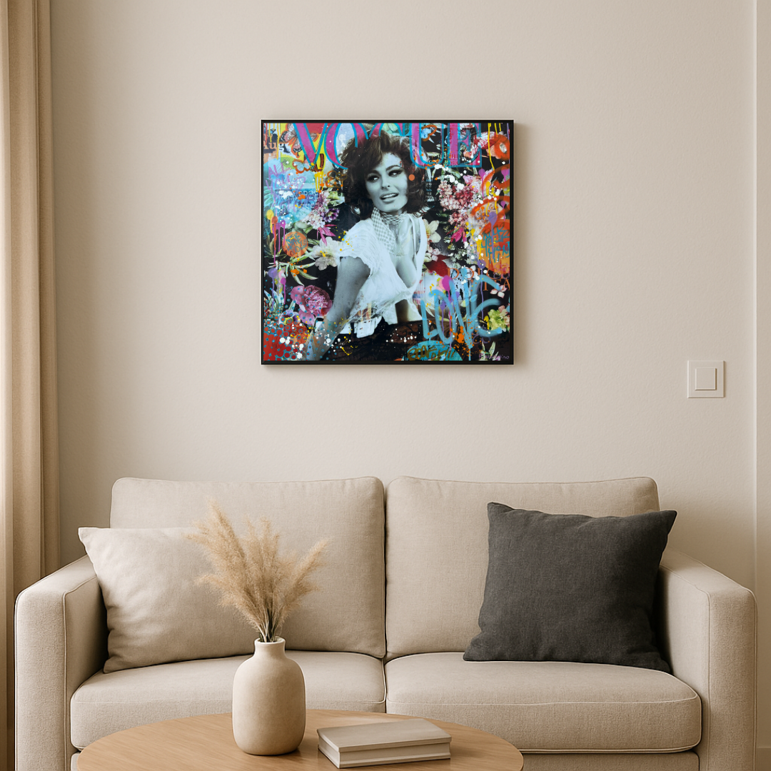En format 80 × 80 cm, Dolce Sophia s’impose comme une pièce forte et lumineuse, idéale pour sublimer un intérieur contemporain, une galerie ou un espace d’art. Elle incarne la rencontre entre cinéma classique, pop art et Street culture, avec la douceur en toile de fond.