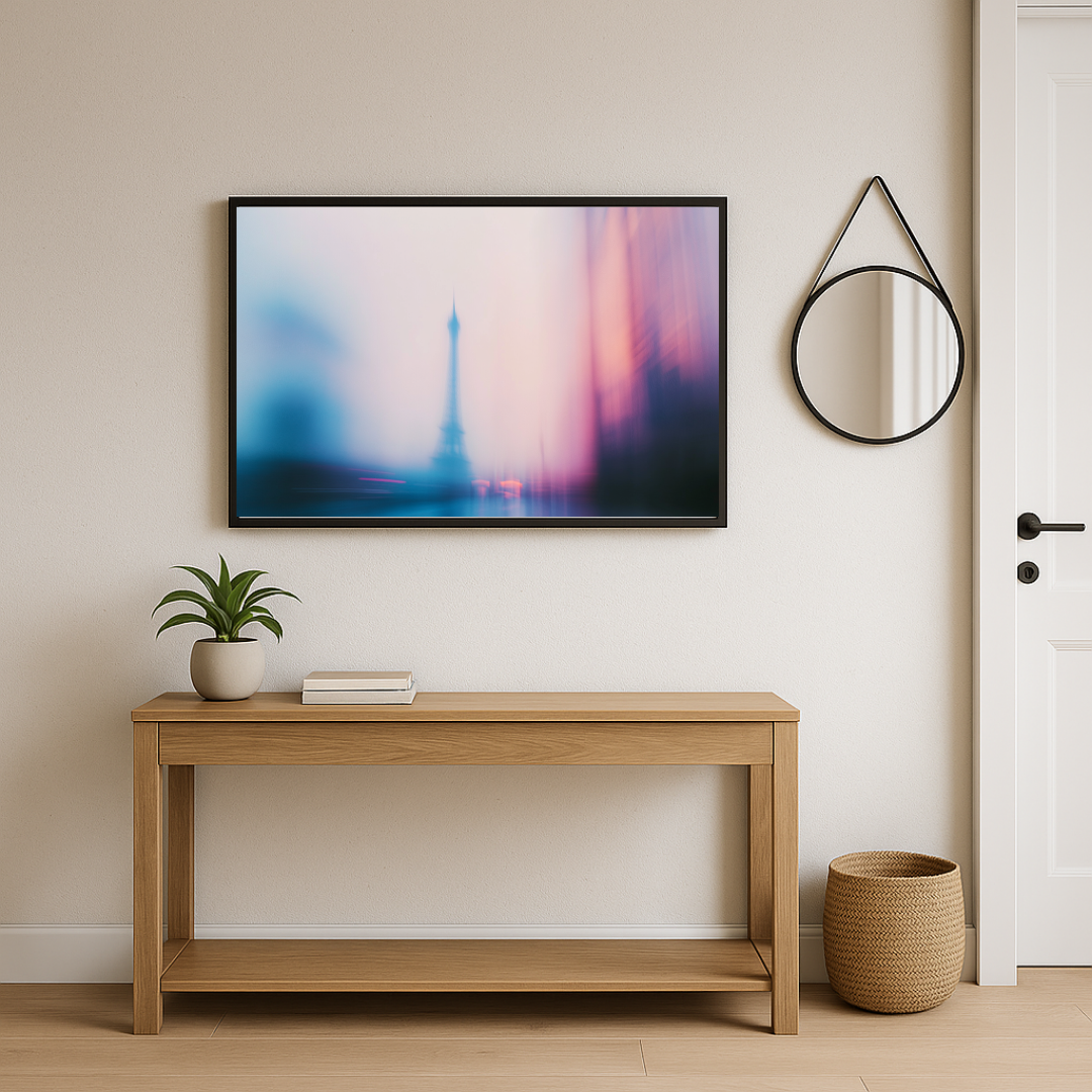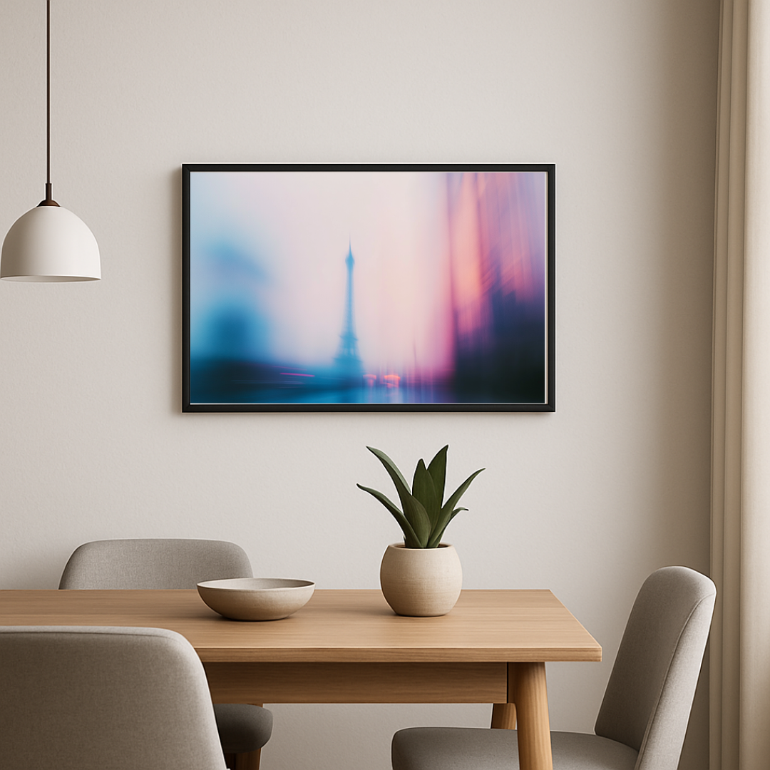 La composition se distingue par son atmosphère onirique. Dans un flou maîtrisé, la silhouette emblématique de la tour Eiffel se devine, se dressant comme une apparition au milieu de dégradés de bleu et de rose. Les contours se dissolvent, invitant le spectateur à une contemplation intérieure, entre réalité et rêve. L’image évoque le silence d’un matin parisien, baigné de douceur et de lumière diffuse, où la ville semble encore endormie.
