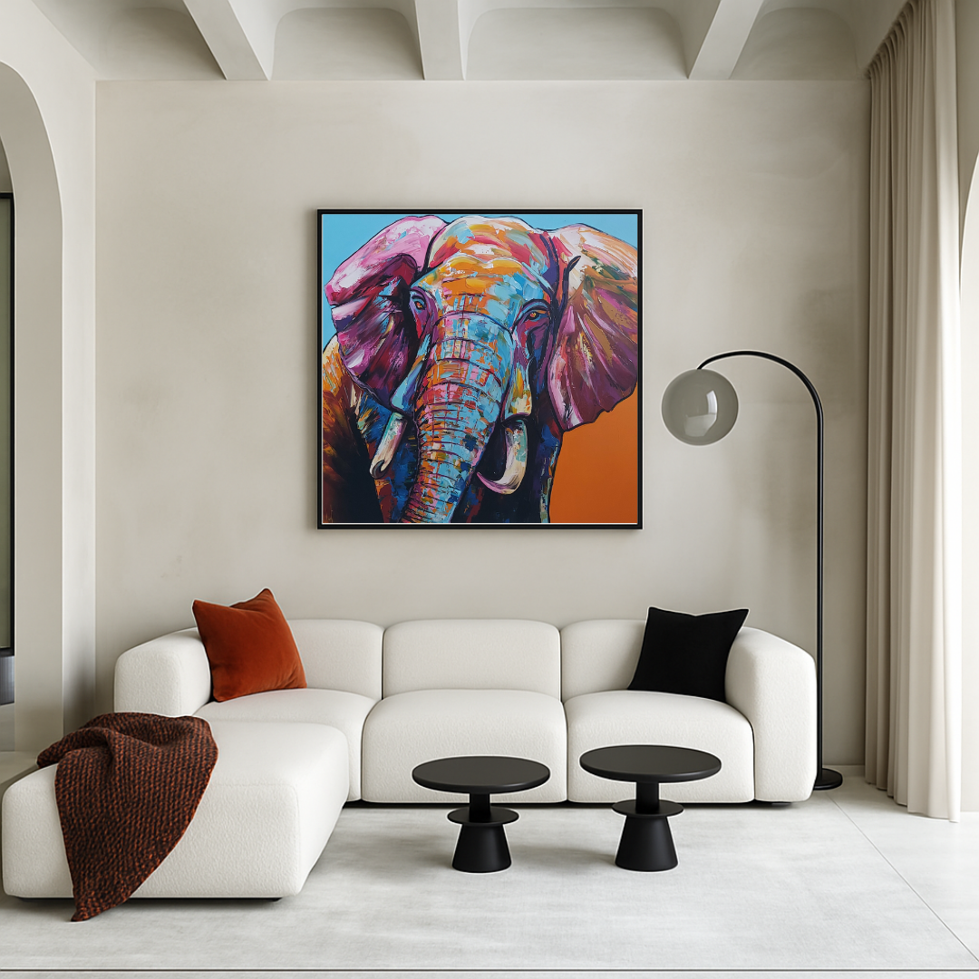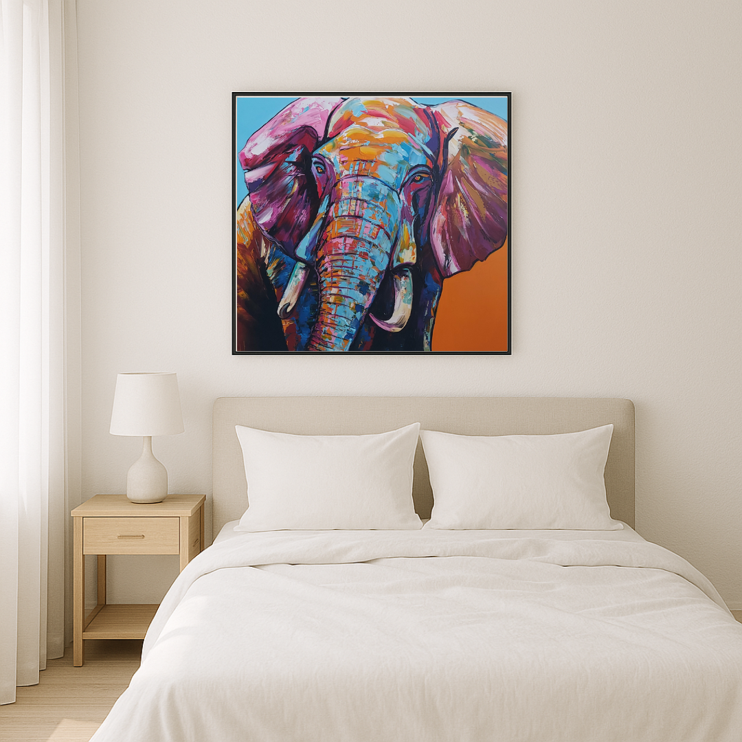 La palette flamboyante mêle fuchsia, turquoise, orange et bleu électrique sur un fond bicolore audacieux, renforçant le contraste entre force tranquille et énergie picturale. Le regard profond de l’éléphant semble percer la surface, imposant une présence magnétique.
