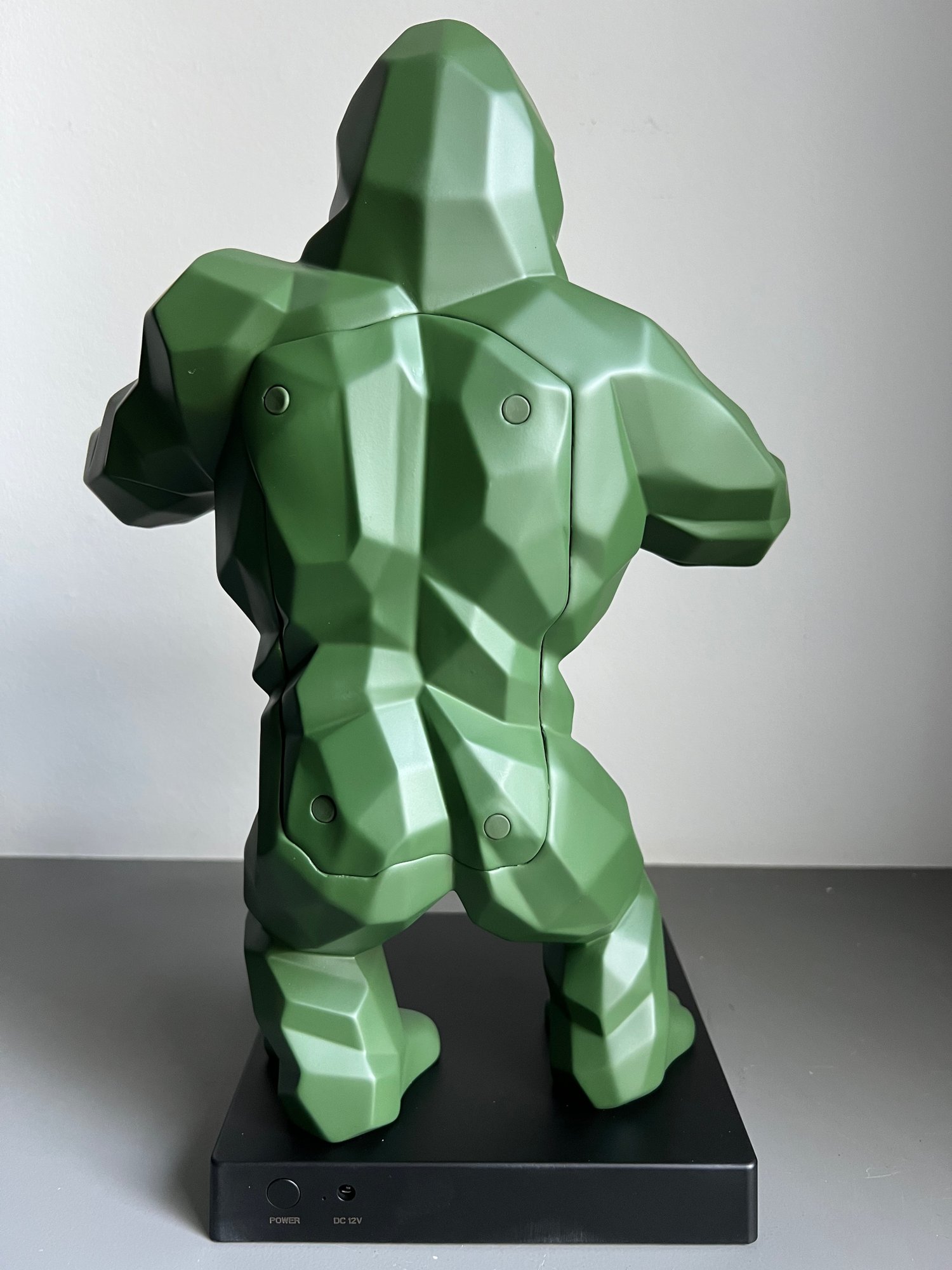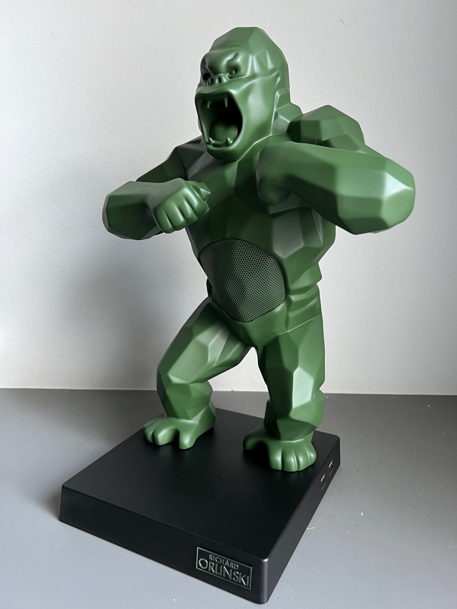 Il s’agit d’une enceinte connectée dotée d’une surface de recharge à induction, donc sans fil pour les mobiles compatibles. L’enceinte connectée est dotée de 3 haut-parleurs installés dans la poitrine de l’animal. Bluetooth, elle peut jouer de la musique, à distance, depuis un smartphone ou une tablette tactile par exemple. Le fabricant annonce une puissance de 15 Watts RMS. La base de l’objet permet de poser l’appareil à recharger dessus. Elle offre une puissance de charge de 10 Watts. Plusieurs appareils peuvent être chargés simultanément. En outre, il y a également 2 prises USB pour brancher directement un câble et là encore recharger un appareil mobile. L’enceinte mesure 37x26x20 cm et pèse 7,5 Kg. signée Richard Orlinski. Elle est livrée dans un « véritable écrin » : une petite valise pour transporter l’appareil partout avec soi, la Kong Escape.