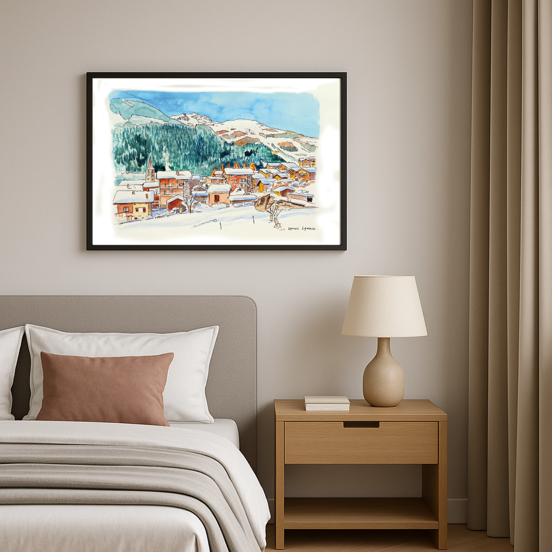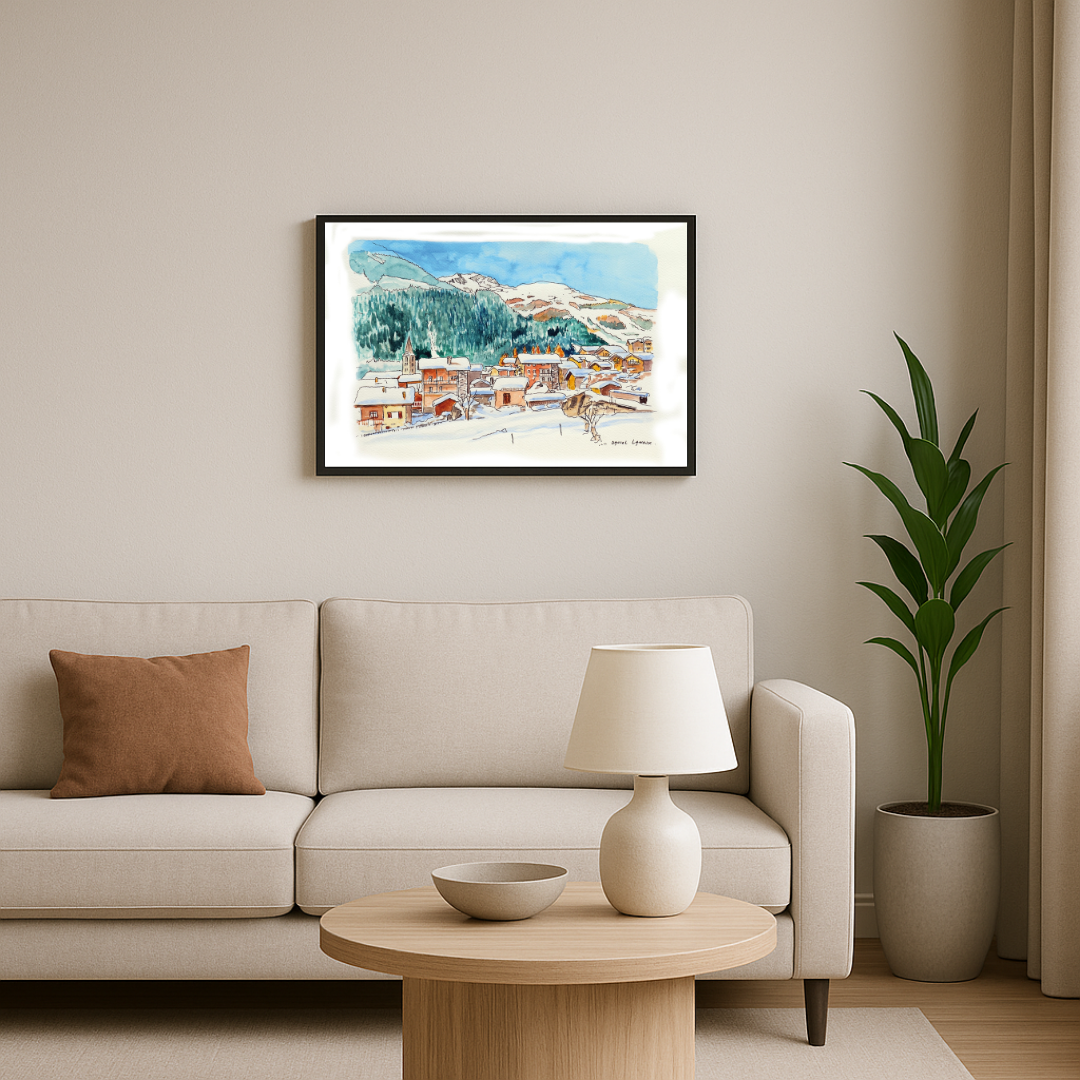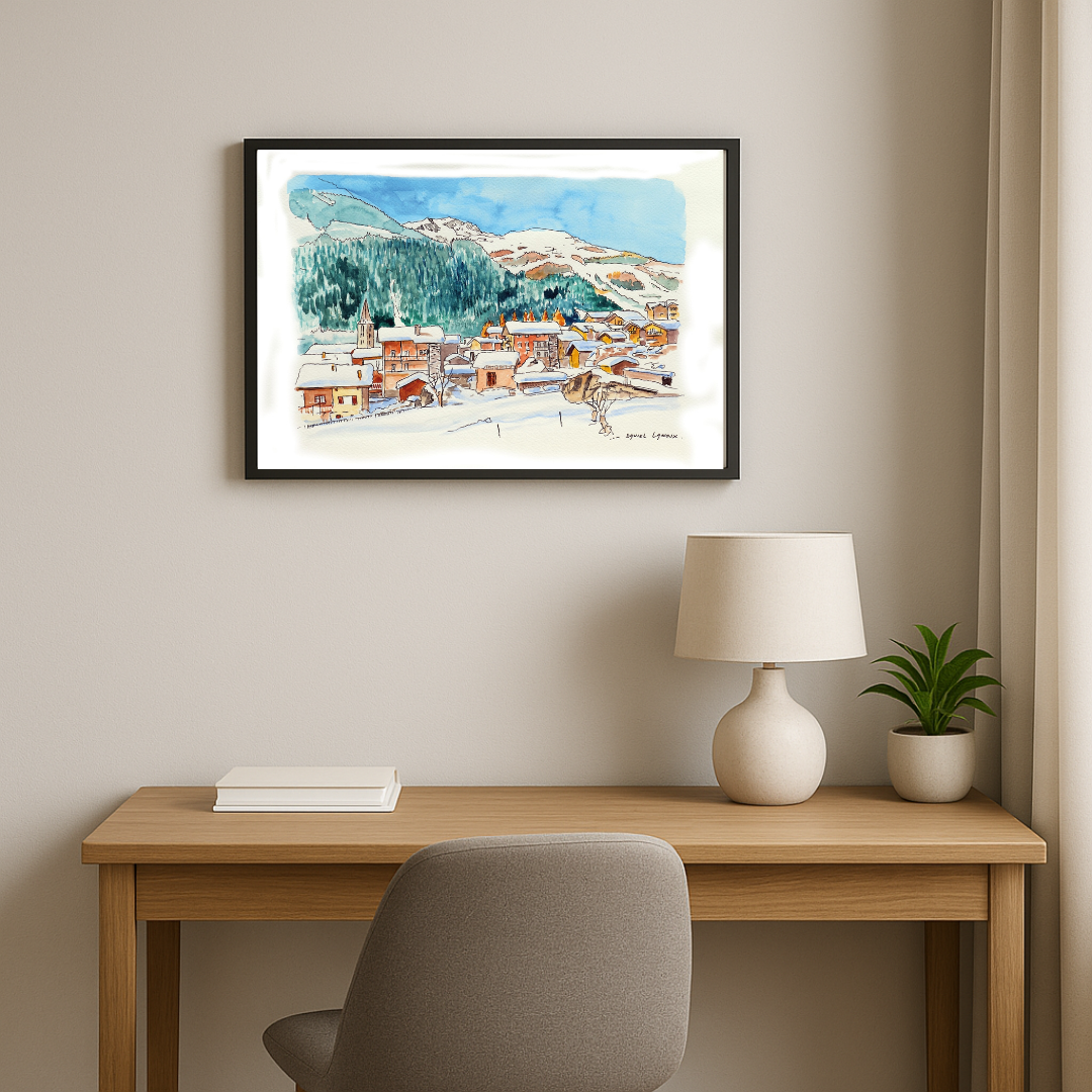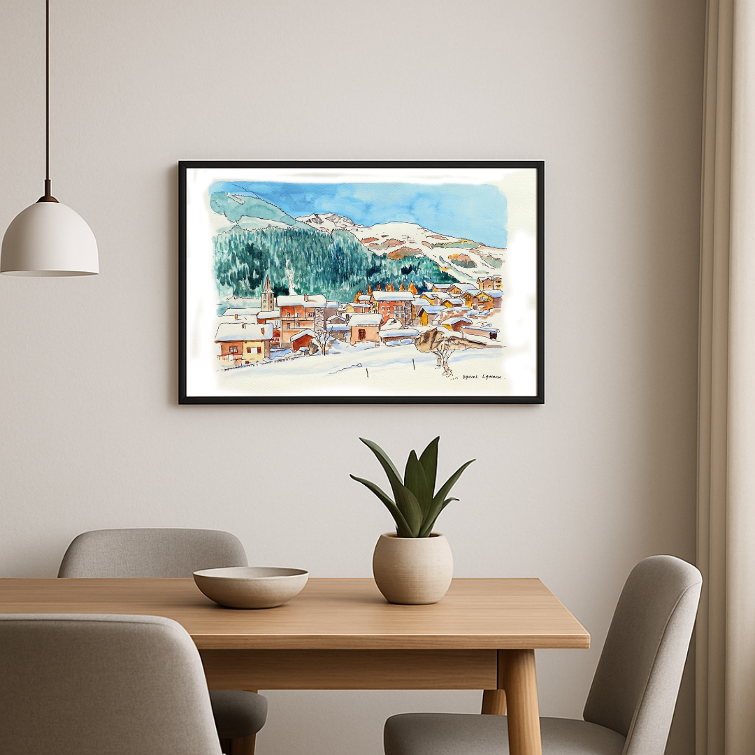 Cette aquarelle originale de Daniel Lanoux met à l’honneur le charmant village d’Evolène, situé au cœur du Valais et membre de l’association des plus beaux villages de Suisse. Réalisée au format 30 x 40 cm ou 50 x 65 cm, l’œuvre saisit avec finesse la beauté hivernale de ce village pittoresque, entouré de montagnes majestueuses et de forêts enneigées. Les toits recouverts de neige et les cheminées fumantes traduisent l’atmosphère chaleureuse et conviviale d’un village alpin où traditions et authenticité occupent une place centrale.