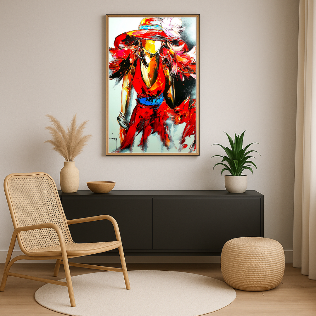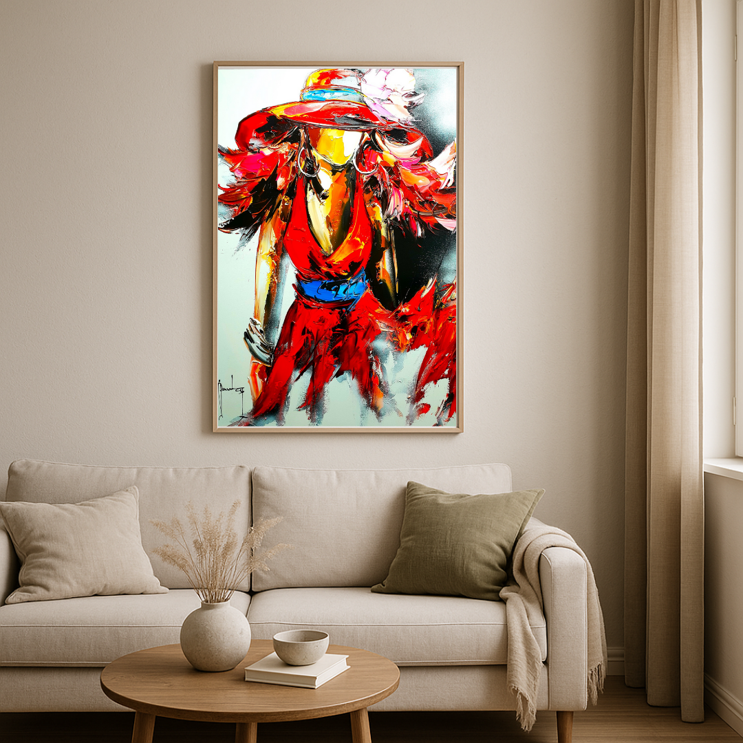 La silhouette féminine, drapée dans une robe rouge flamboyante, avance avec assurance, ses cheveux et son vêtement semblant danser au rythme d’un souffle invisible. Le chapeau à larges bords, orné d’une plume et ceint d’un bleu éclatant, accentue l’allure à la fois mystérieuse et sophistiquée du personnage. La matière généreuse, travaillée en épaisseur, confère à la scène une intensité vibrante, comme animée d’un élan vital.