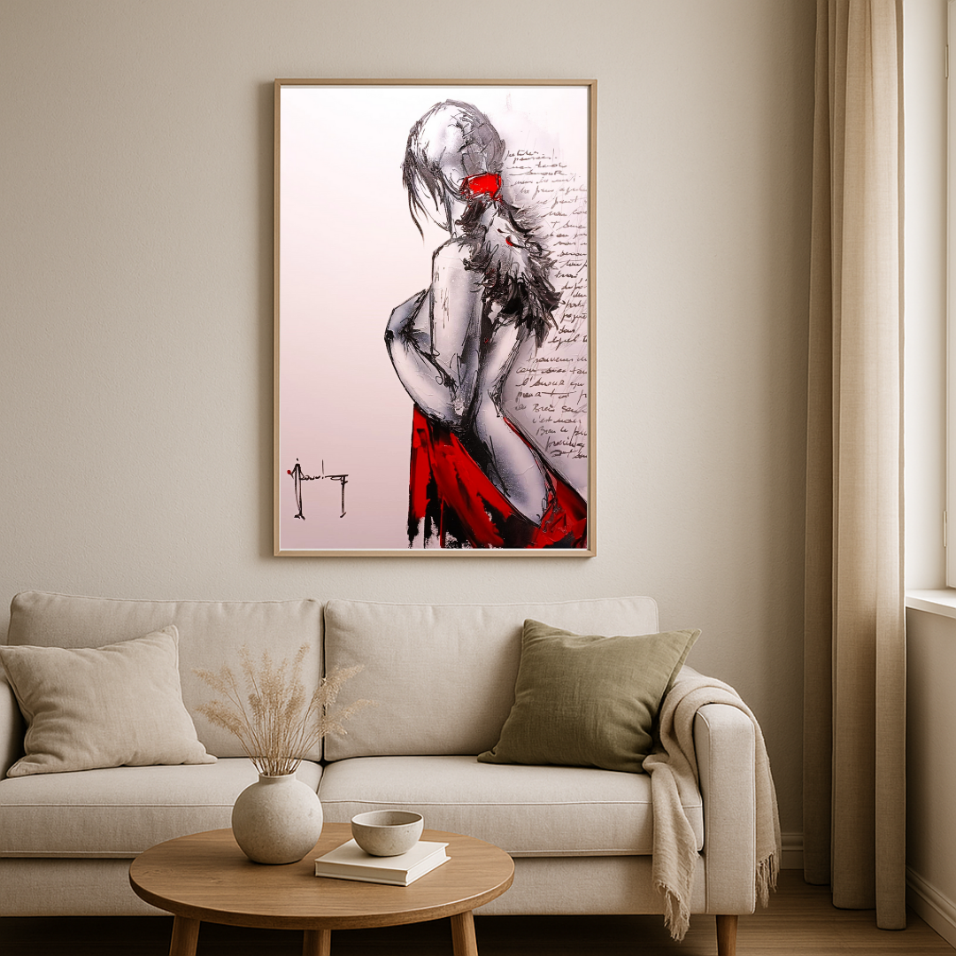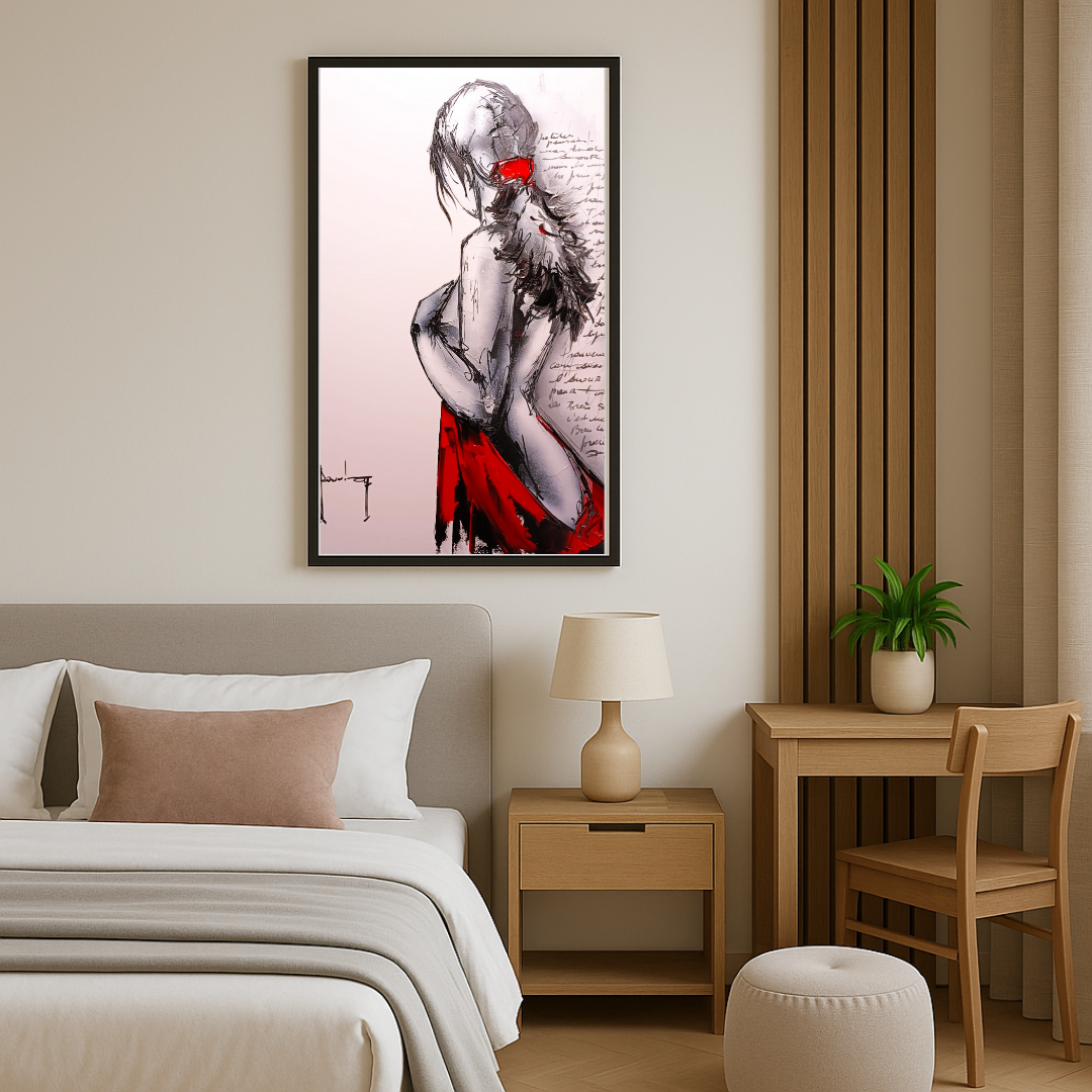 La figure, esquissée en noir et blanc, se détache avec élégance sur le fond clair, accentuée par des rehauts de rouge flamboyant qui attirent le regard : le ruban dans les cheveux et le drapé qui enveloppe le corps. Ces éclats symbolisent la passion et la vitalité au cœur d’une composition tout en retenue. En arrière-plan, des fragments de texte manuscrit apportent une dimension intime, comme une confidence discrète offerte au spectateur.
