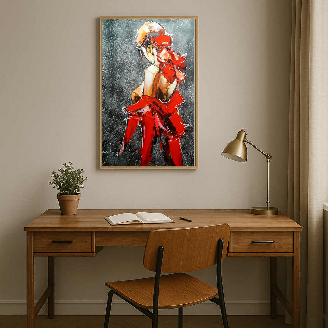 Avec Geisha Rouge, fond marbré, Christof Monnin livre une vision puissante et sensuelle de la féminité. Réalisée à l’acrylique au couteau, l’œuvre se distingue par ses matières généreuses et ses contrastes saisissants.
