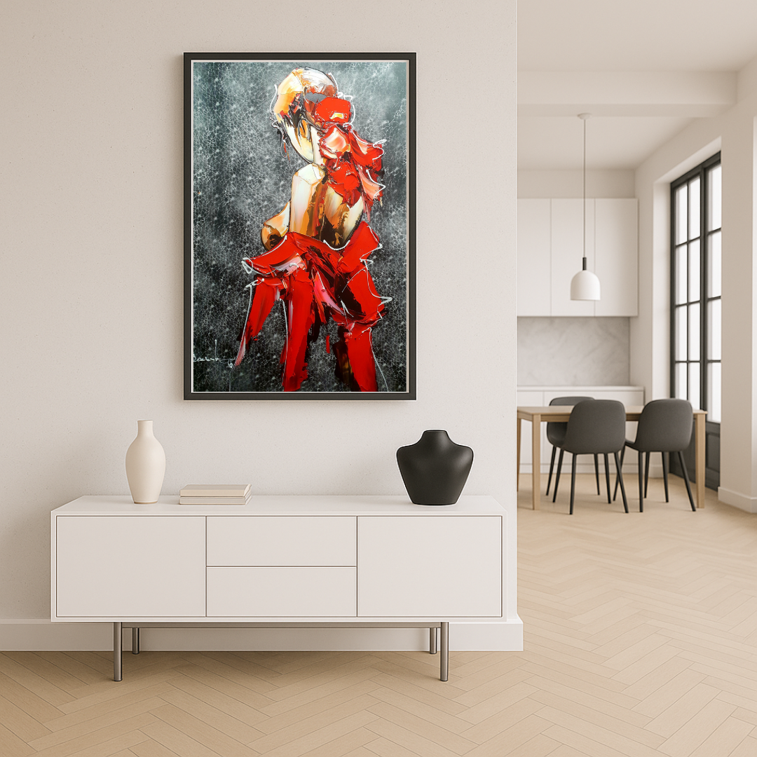 La silhouette, vue de dos, se déploie dans une posture gracieuse, enveloppée d’un drapé rouge flamboyant dont les plis semblent vibrer à chaque touche de peinture. Le fond marbré noir et argent, à la texture subtile, crée un écrin mystérieux qui accentue la luminosité du personnage et la modernité de la composition.