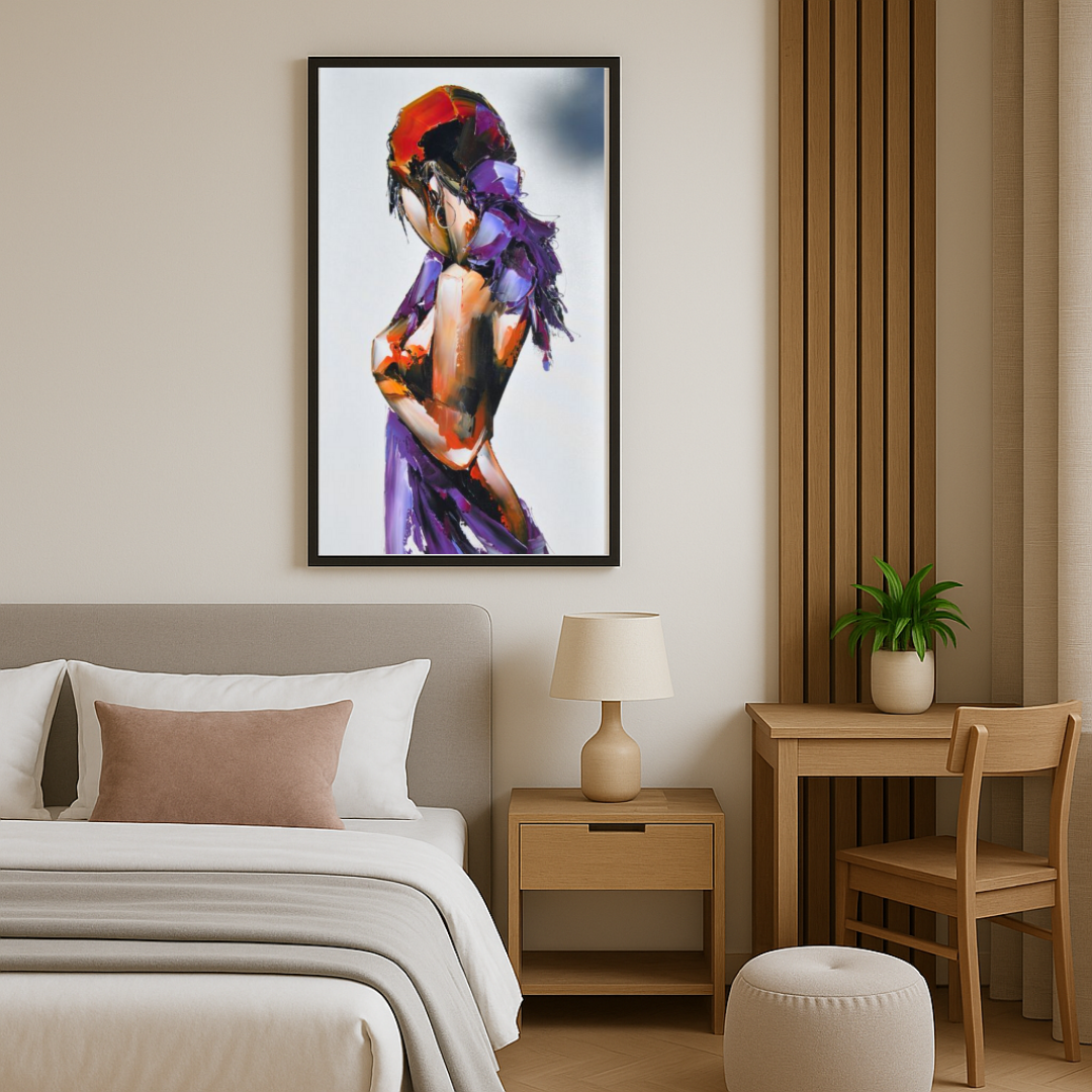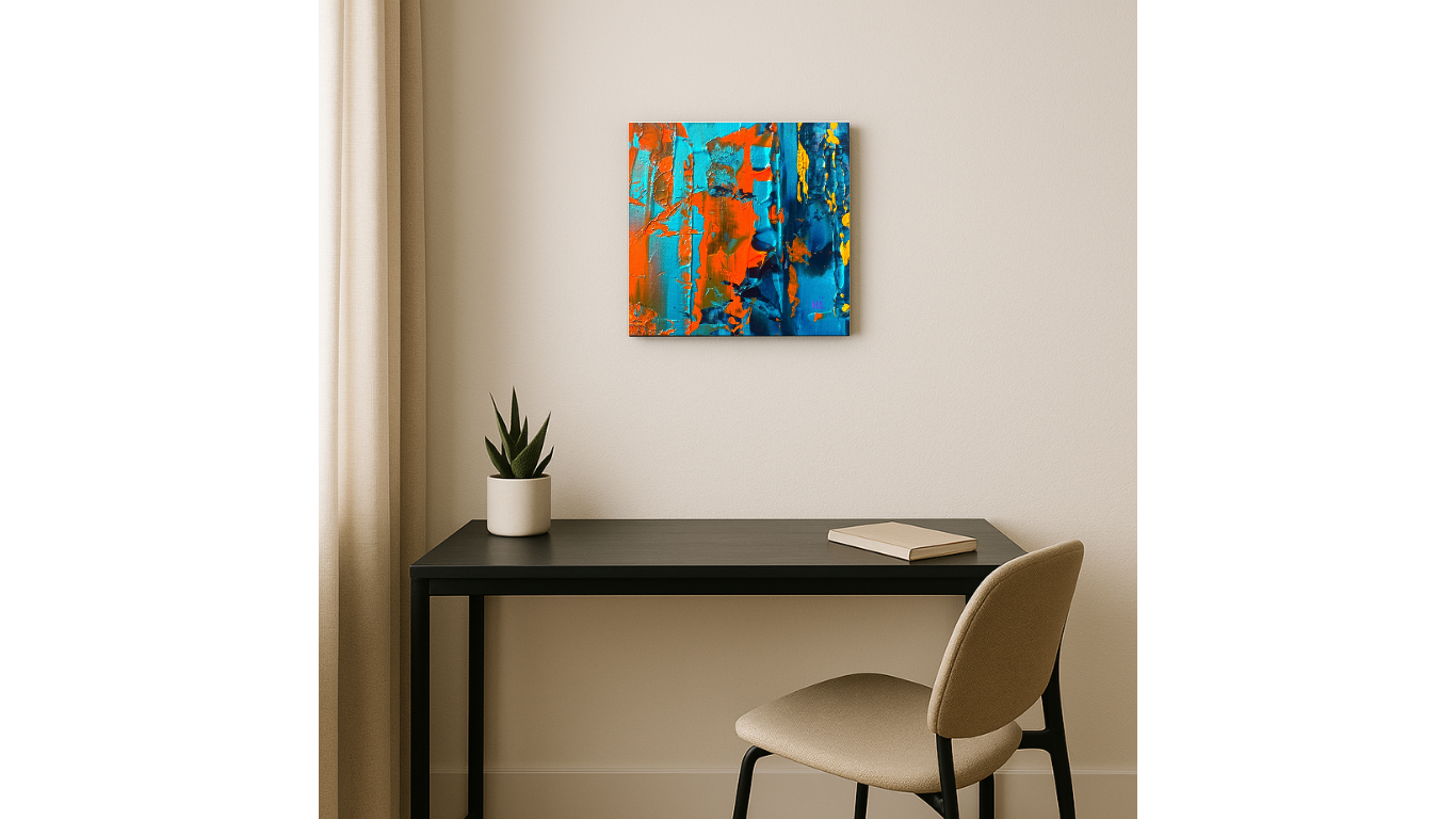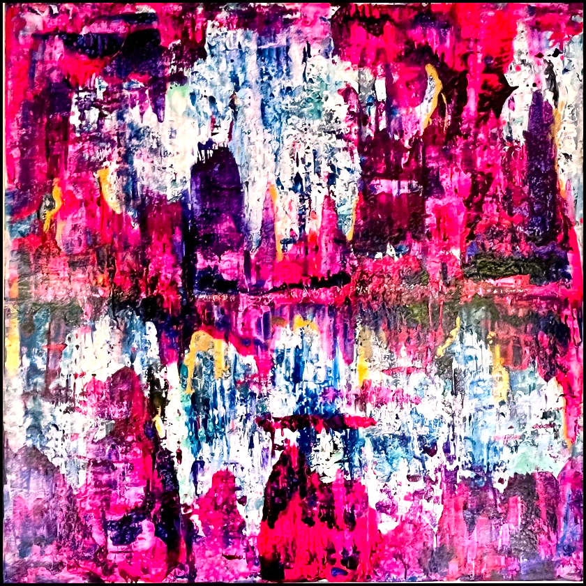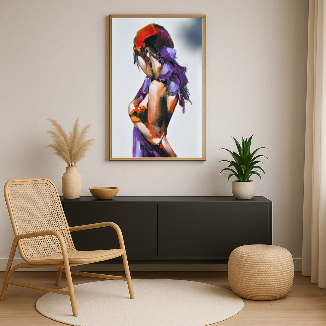 Avec Geisha Violette, Christof Monnin nous plonge dans un univers de sensualité et de mystère. D’un geste vif et puissant, l’artiste donne vie à une silhouette féminine élancée, drapée dans des éclats pourpres et orangés qui se mêlent avec intensité. La composition, réalisée à l’acrylique au couteau, fascine par ses textures épaisses et ses contrastes saisissants, où chaque mouvement de la matière raconte une émotion.