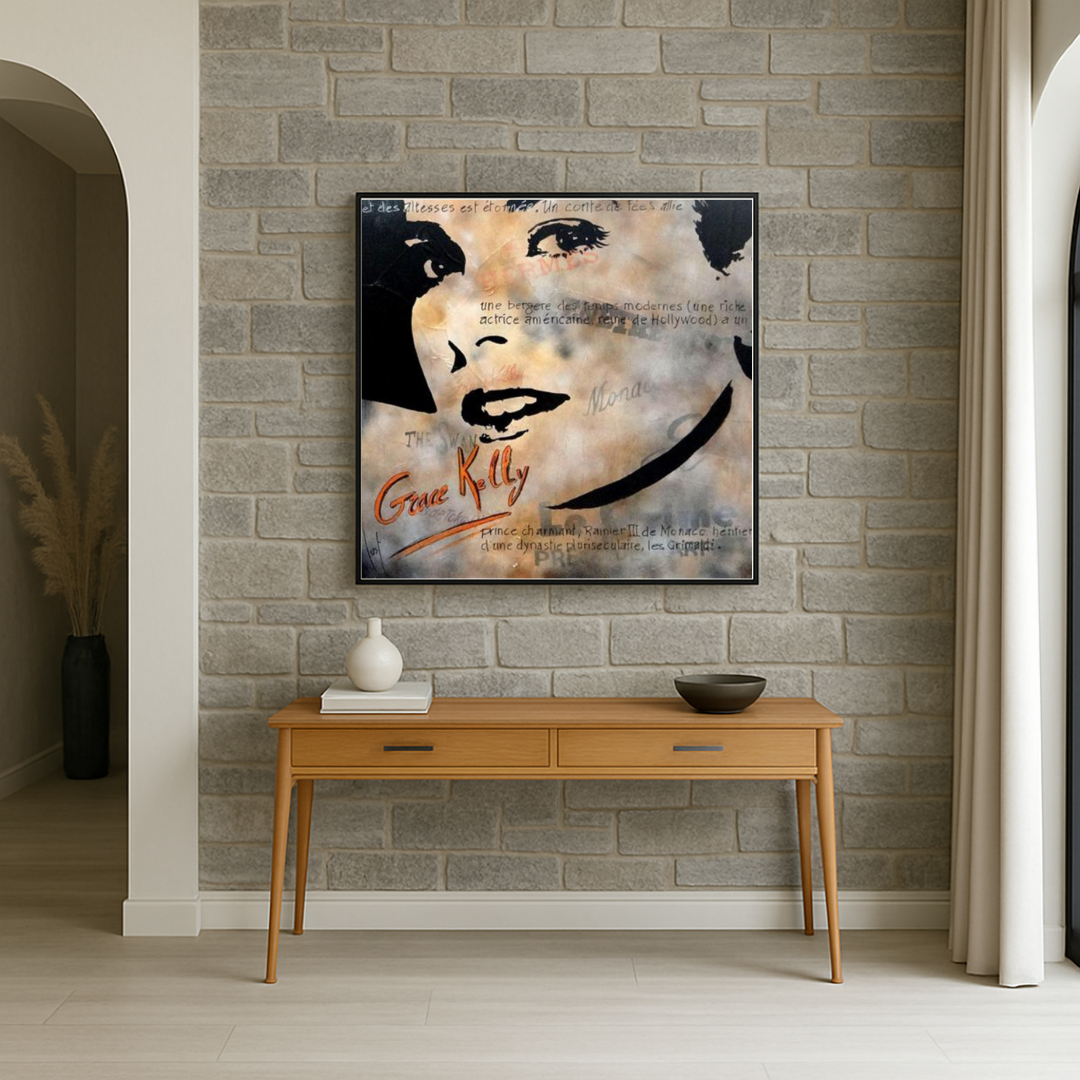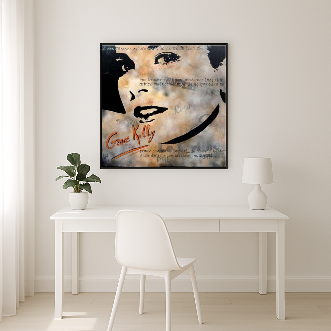 Hommage vibrant à une icône du glamour et de l’élégance, ce portrait revisite avec modernité la légende de Grace Kelly, actrice hollywoodienne devenue princesse de Monaco. L’artiste mêle technique urbaine, collage typographique, et pochoir stylisé pour créer une composition à la fois rétro et contemporaine.