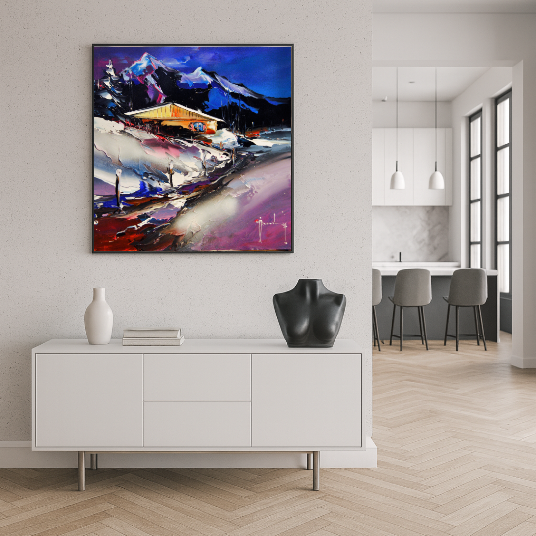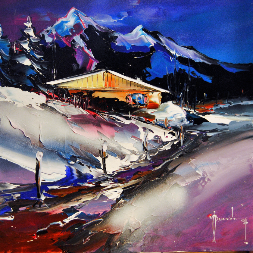 L’artiste capture ici une vue pittoresque des toits aux tuiles rouges, dominés par l’élégant clocher de l’église qui se détache fièrement à l’horizon. Le ciel clair et lumineux, habité par le vol gracieux d’oiseaux, ouvre la composition vers les sommets alpins, rappelant l’harmonie entre le village et son environnement. Par son style délicat et ses couleurs fraîches, Daniel Lanoux transmet l’atmosphère paisible de cette bourgade, où chaque détail évoque l’histoire et l’âme des lieux.