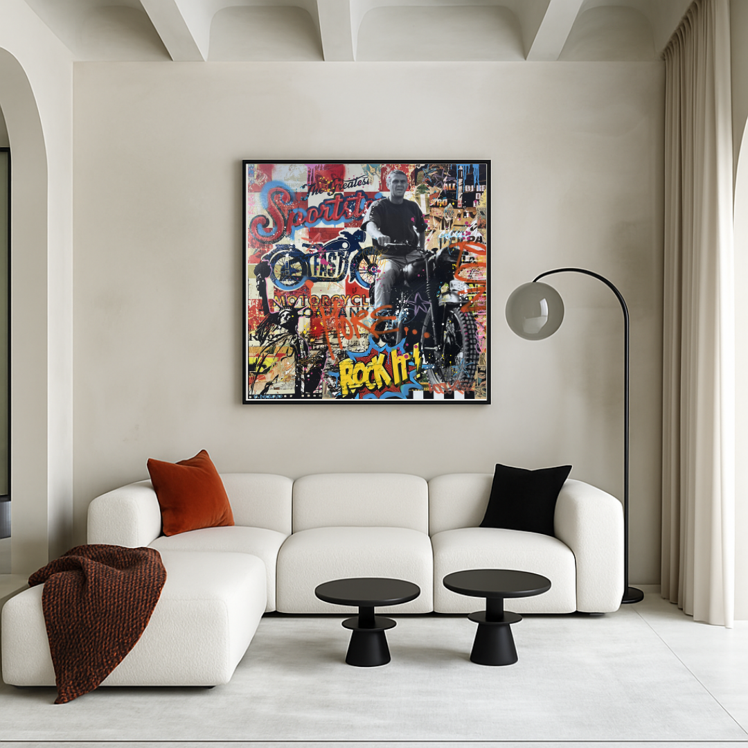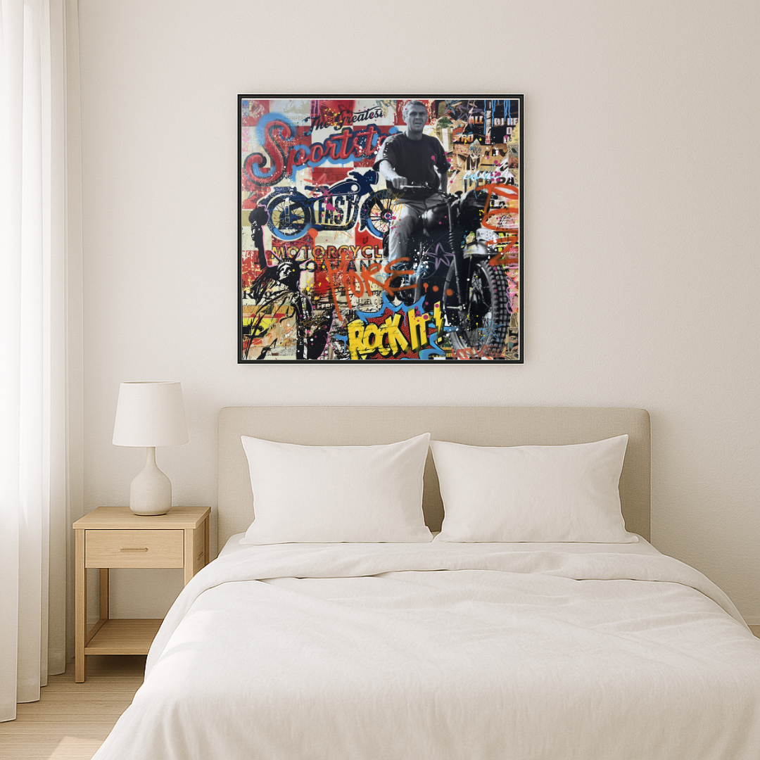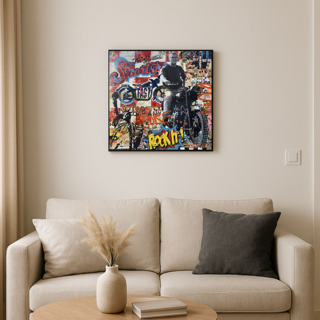 Sur sa moto, McQueen apparaît en noir et blanc, prêt à s’élancer, symbolisant l’audace, la vitesse et l’indépendance. Autour de lui, un collage foisonnant mêle affiches vintage, typographies rétro, graffiti, éclaboussures de peinture et slogans comme “Rock It!”, “Sports”, ou “Motorcycle”. Les couleurs vives, les coulures et les textures créent un contraste puissant avec la photographie, capturant l’essence du King of Cool.