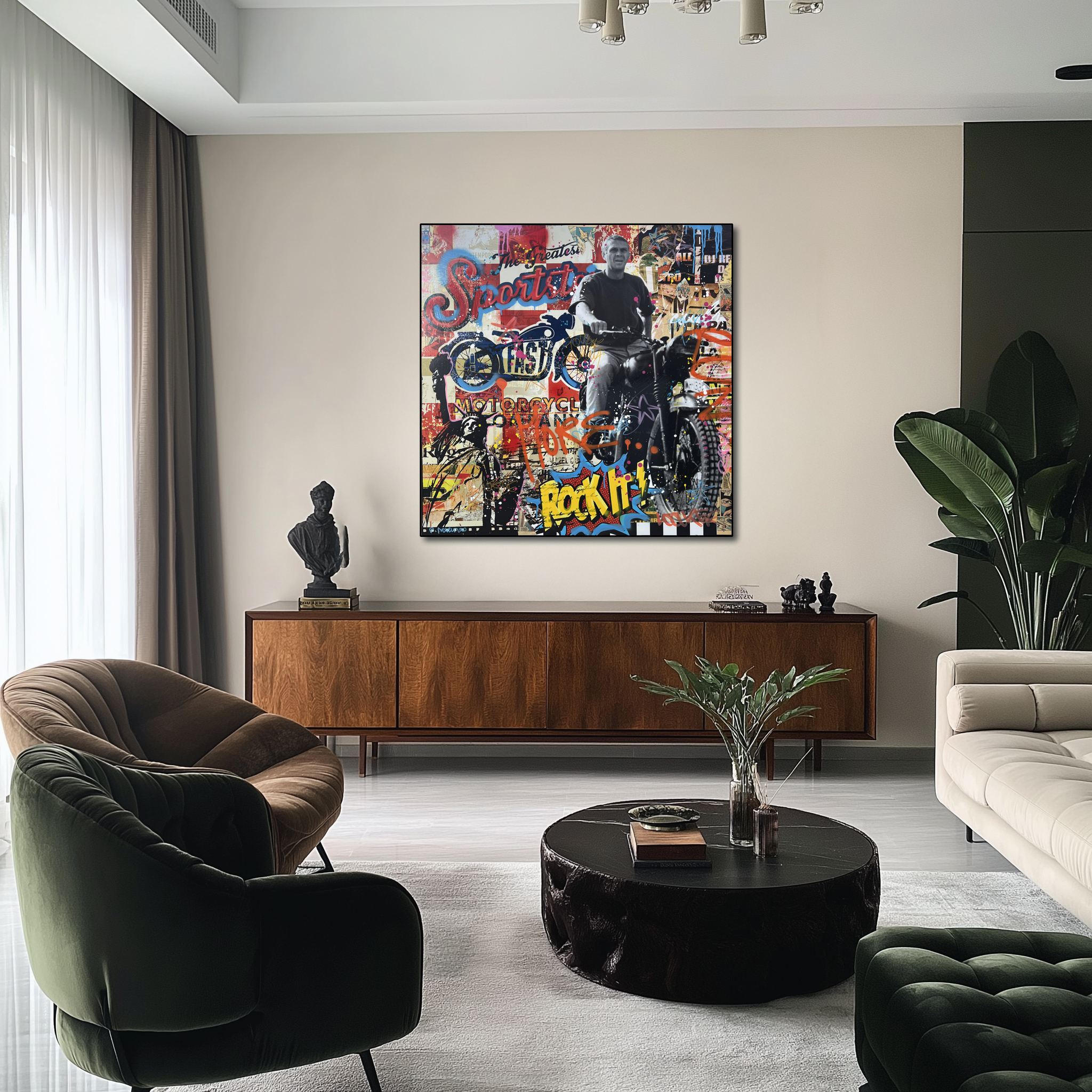 Greatest Steve s’adresse aux passionnés d’art contemporain, de moto, de cinéma culte et de liberté. Une œuvre qui respire l’adrénaline, l’attitude et l’authenticité.