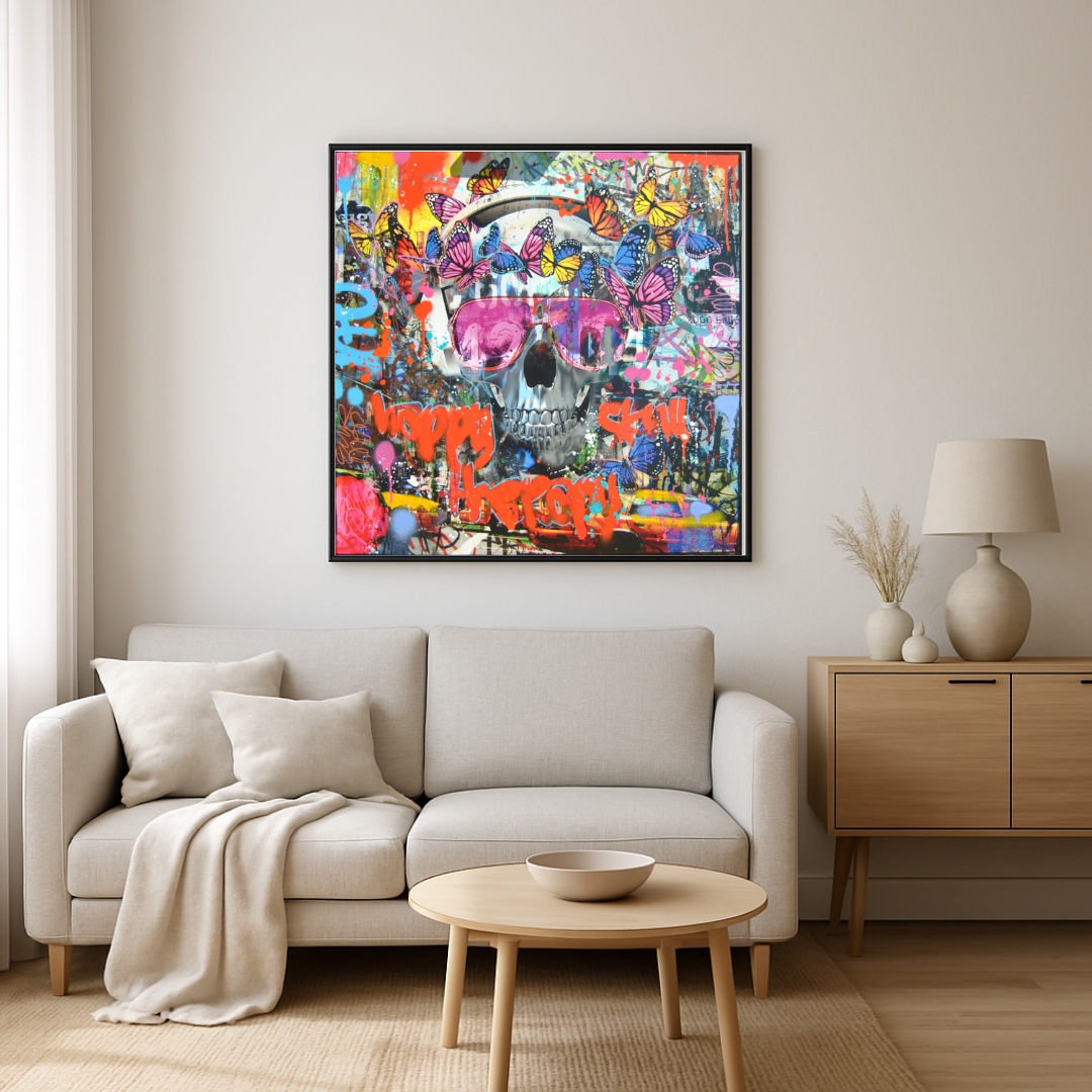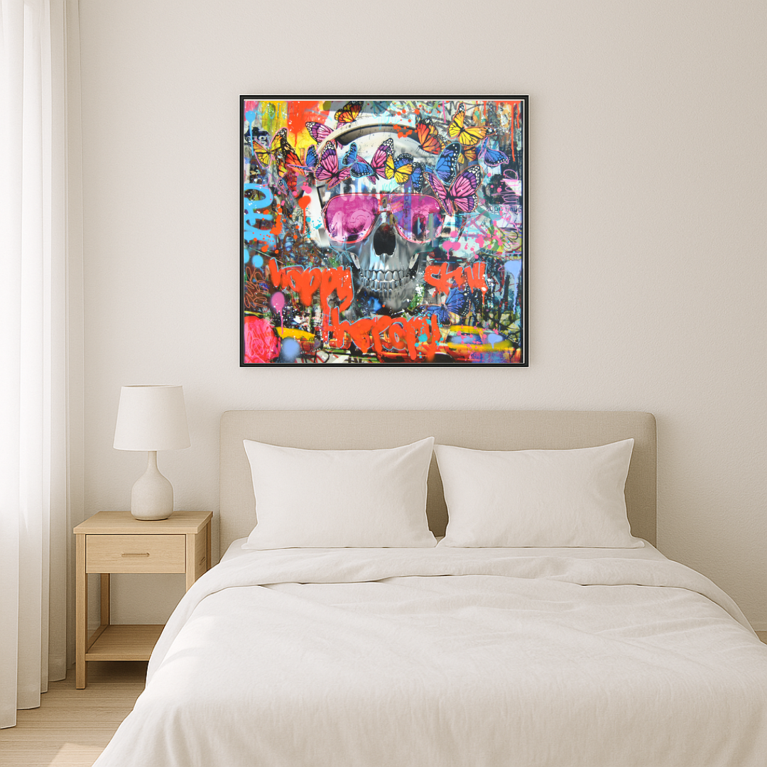 Dans cette composition, le crâne, symbole universel de la fragilité humaine, est transformé en icône pop et joyeuse. Orné de papillons multicolores, surmonté de lunettes miroir et entouré de graffitis explosifs, il incarne un contraste saisissant entre la gravité du sujet et l’énergie euphorique de la couleur. Le fond, saturé de tags et d’éclaboussures, rappelle l’esthétique des murs urbains, là où s’expriment librement les voix de la rue.
