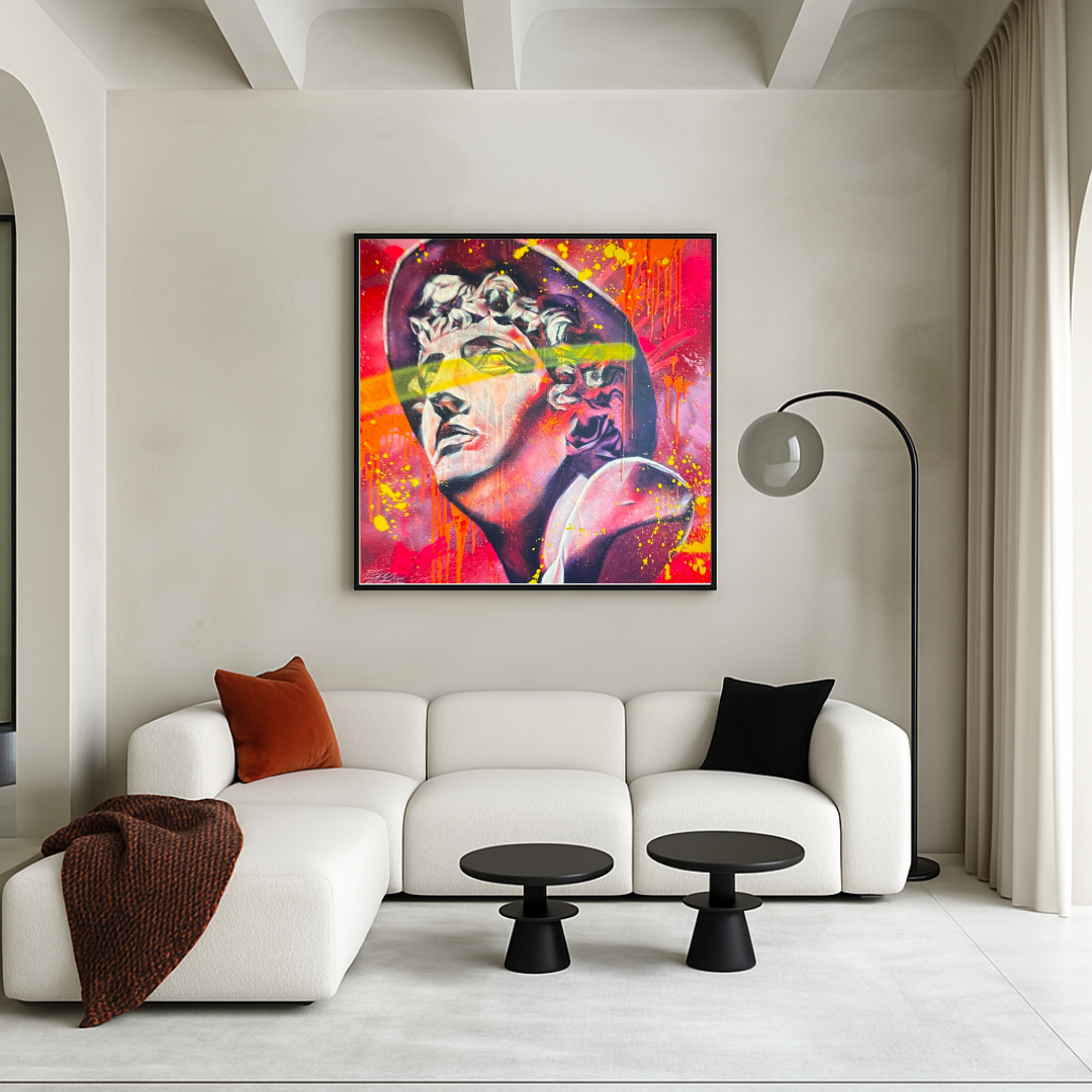 Repy One revisite ici la figure mythologique d’Hermès à travers un portrait sculptural teinté de modernité. Les coulures, éclaboussures et tags fluos viennent rompre la solennité du marbre, injectant au dieu messager une intensité urbaine et une urgence presque punk. Le regard, traversé par une ligne jaune acide, capte l’attention et interroge notre lecture du sacré, du pouvoir, du mouvement.