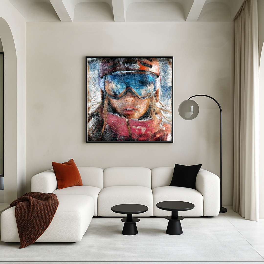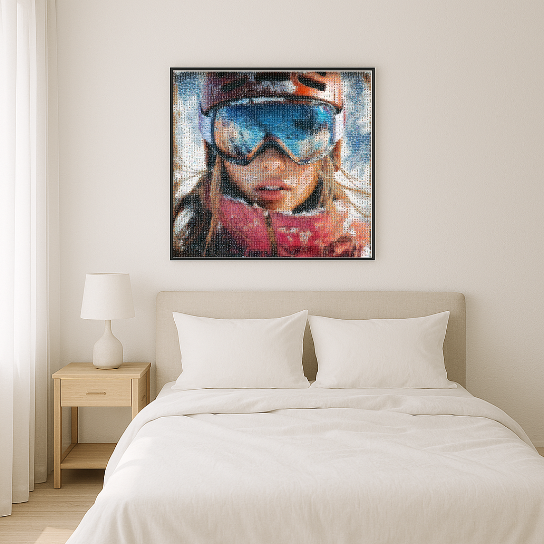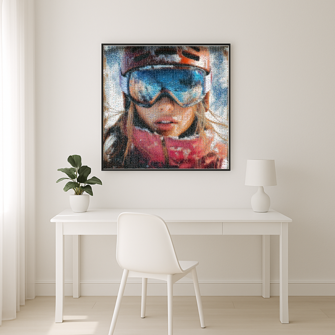La composition prend toute sa singularité dans sa mosaïque de plus de 10 000 vignettes. Chacun de ces fragments visuels contribue à former le portrait saisissant d’une jeune femme équipée pour le ski, son regard se reflétant dans les larges lunettes où se dessinent des paysages enneigés. De loin, le spectateur découvre un portrait moderne, énergique et expressif. De près, l’œuvre se révèle comme un patchwork narratif, où chaque vignette raconte une micro-histoire, enrichissant la perception globale et multipliant les niveaux de lecture.