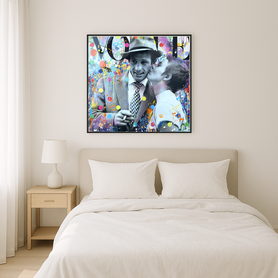 Jean-Paul I Love You évoque la liberté, la bohème parisienne, l’amour en pleine rue, sans artifice. Entre cinéma culte, pop art et street culture, cette œuvre au format 80 × 80 cm capture l’âme d’une époque tout en la propulsant dans le langage visuel d’aujourd’hui.