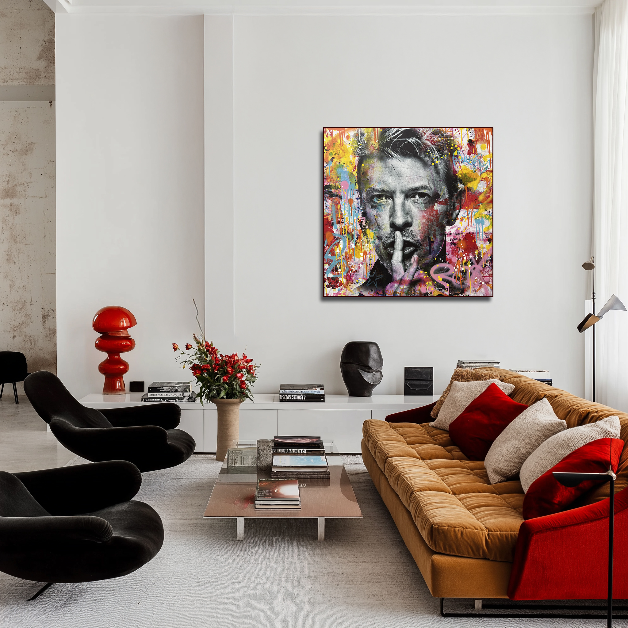 Au centre, le visage d’une icône mondiale de la pop et de la métamorphose artistique émerge en noir et blanc, dans une expression silencieuse et captivante. Son doigt posé sur les lèvres évoque l’intimité, le secret, mais aussi la force intérieure. Autour de ce portrait, Novarino déploie un chaos parfaitement orchestré : coulures fluorescentes, éclats de couleur, tags, étoiles, traces de spray et textures urbaines.