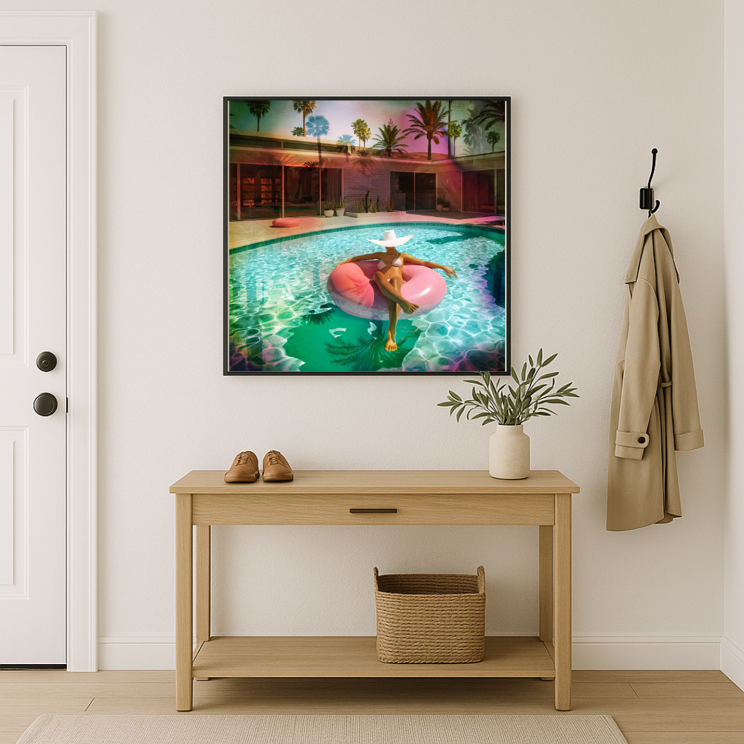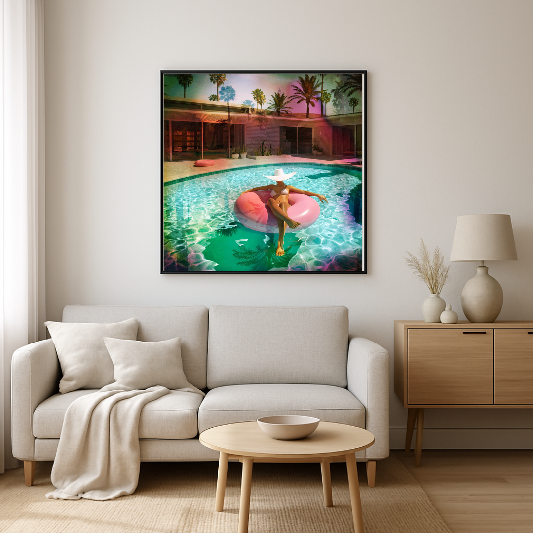 Avec La Modern Life, Fabien Novarino capture l’essence d’un art de vivre résolument contemporain, empreint de luxe, de détente et d’hédonisme. La scène, baignée de lumière, met en avant une silhouette féminine en maillot de bain blanc et grand chapeau, flottant paisiblement sur une bouée rose au milieu d’une piscine turquoise. En arrière-plan, une villa moderniste et des palmiers majestueux évoquent les paysages iconiques de Palm Springs et l’imaginaire californien.