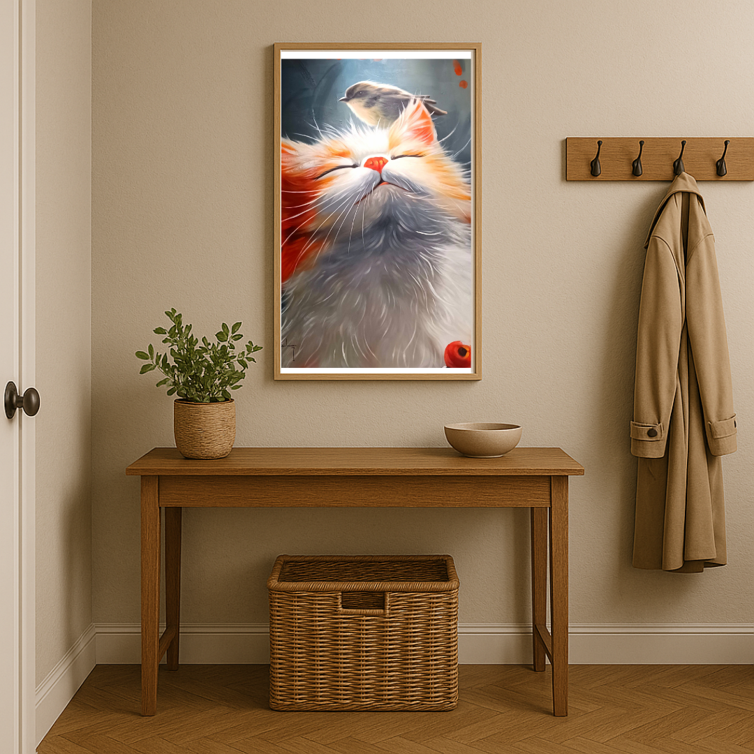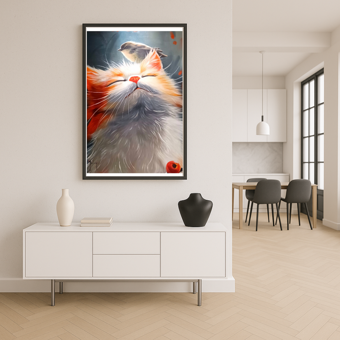 La finesse des textures, en particulier dans le pelage du chat, contraste avec l’intensité des couleurs chaudes et lumineuses. Les nuances orangées et blanches du félin s’accordent avec la délicatesse du plumage, créant une harmonie tendre et joyeuse. La composition respire la complicité, la confiance et la sérénité.