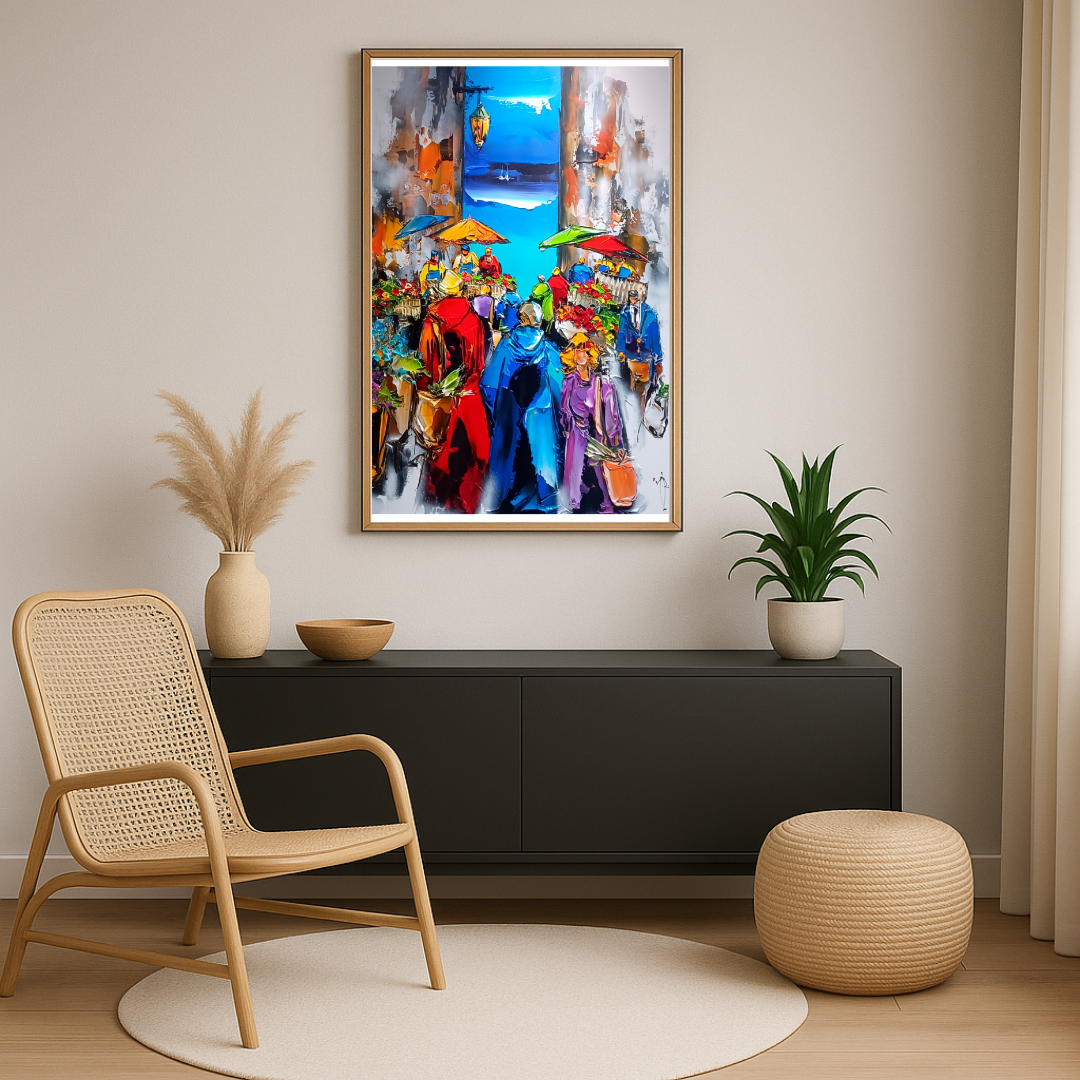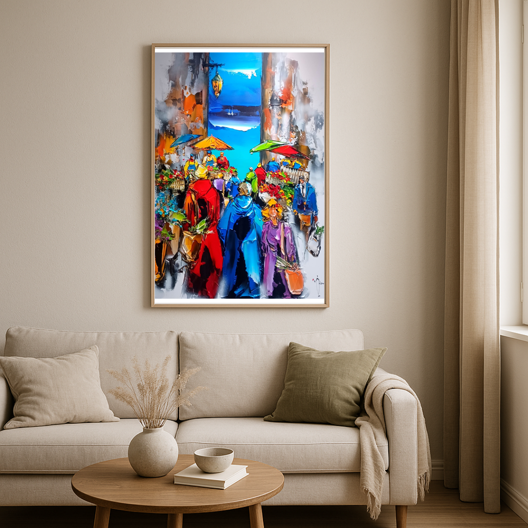 Les personnages, esquissés dans un flot de couleurs vives, se pressent autour des étals fleuris et des parasols éclatants. Le bleu profond de la mer, visible en arrière-plan, ouvre la scène vers l’horizon, donnant une respiration lumineuse à cette composition dense et animée. Chaque coup de spatule traduit le mouvement, les échanges, et l’énergie joyeuse du marché.