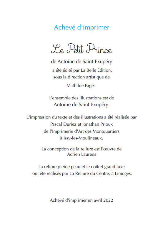 Achevé d’imprimer en avril 2022, cet écrin de poésie et de philosophie universelle célèbre autant la beauté du texte que l’art de la reliure française. Une pièce de collection destinée aux bibliophiles et aux amoureux du Petit Prince.