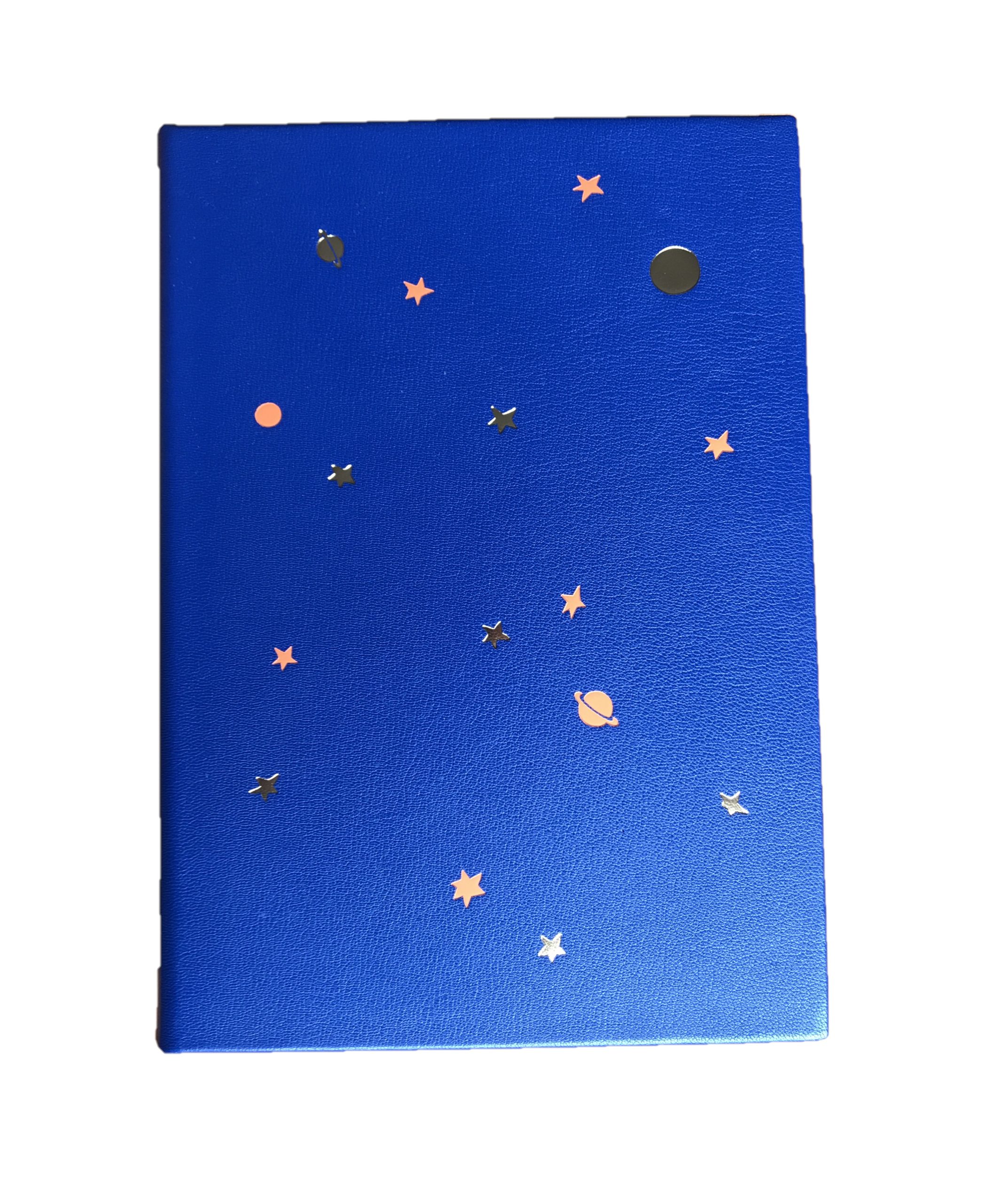 L’illustration originale, minutieusement reproduite sur la reliure, a nécessité l’usage de dix fers à dorer, témoignant d’un savoir-faire artisanal d’une grande finesse. Chaque détail, des étoiles dorées au Petit Prince s’envolant parmi les oiseaux, a été exécuté avec un soin extrême.