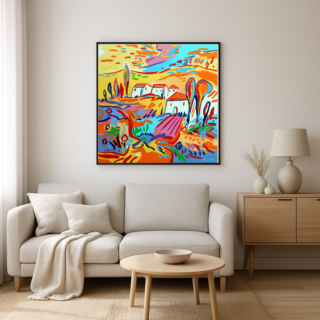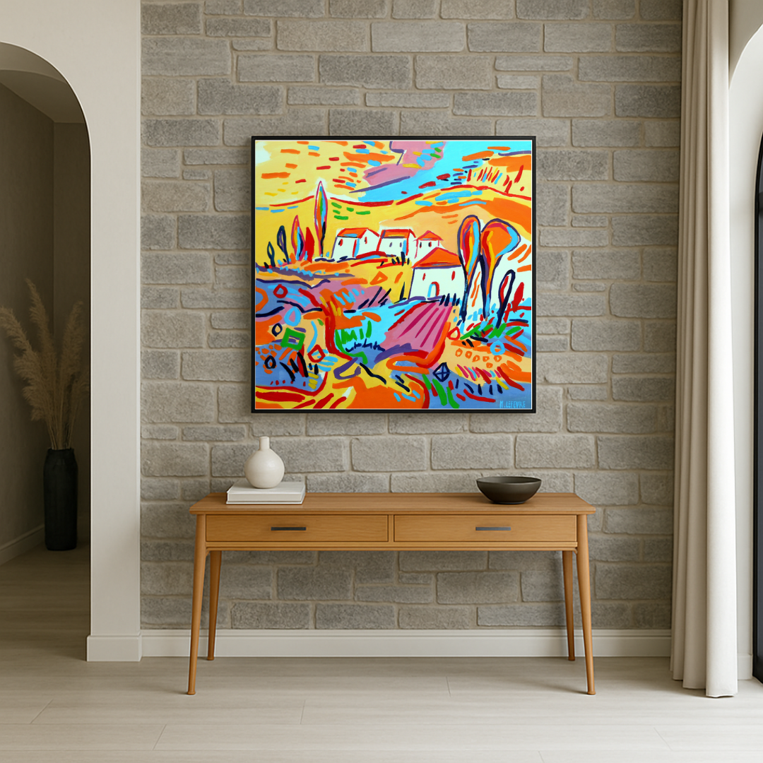 Ce tableau éclatant transporte le spectateur au cœur d’un paysage méditerranéen stylisé, baigné de lumière et de chaleur. Les maisons aux toits rouges, nichées au milieu de collines ondulantes, évoquent un village imaginaire, joyeux et vivant. Les arbres, les chemins et les champs sont représentés à travers des aplats de couleurs vives et des formes simplifiées, presque enfantines, qui rappellent la liberté de l’art naïf ou du fauvisme.