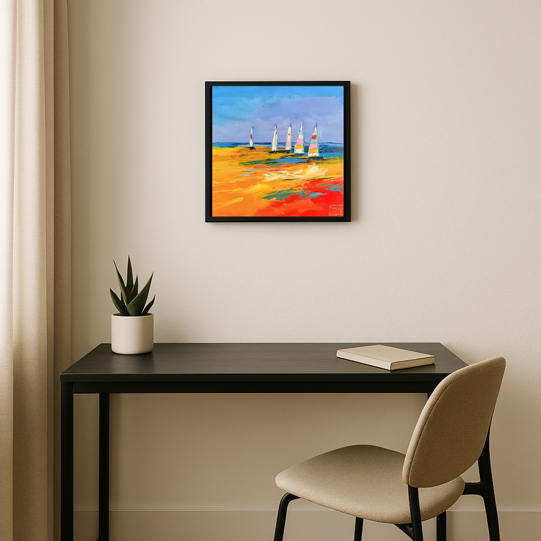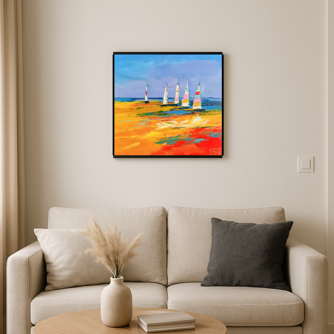 Le travail au couteau donne à la peinture une texture intense et expressive, créant un mouvement visuel puissant. Les cinq voiliers, stylisés et colorés, semblent animés par le vent, comme une invitation à vivre l’instant présent.
