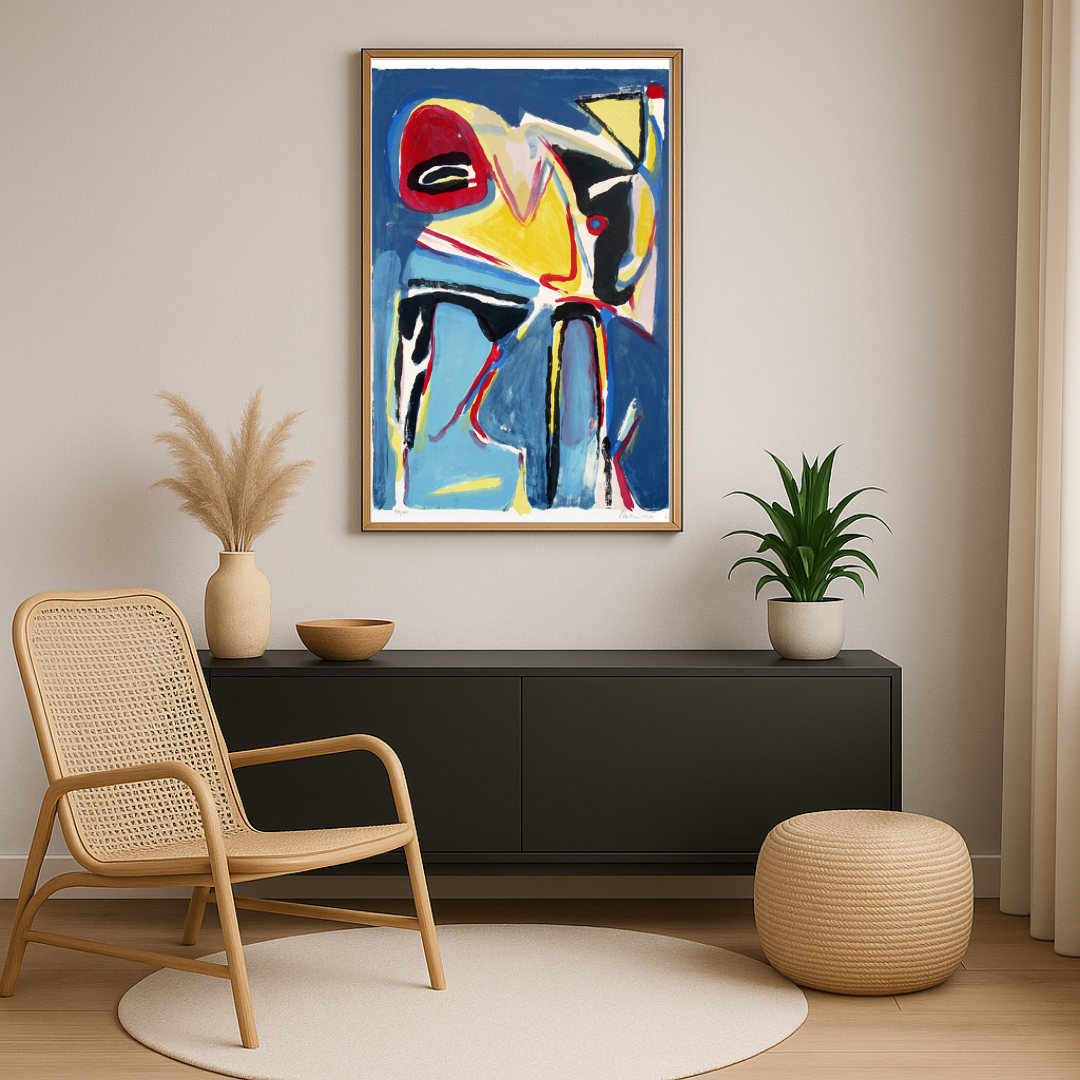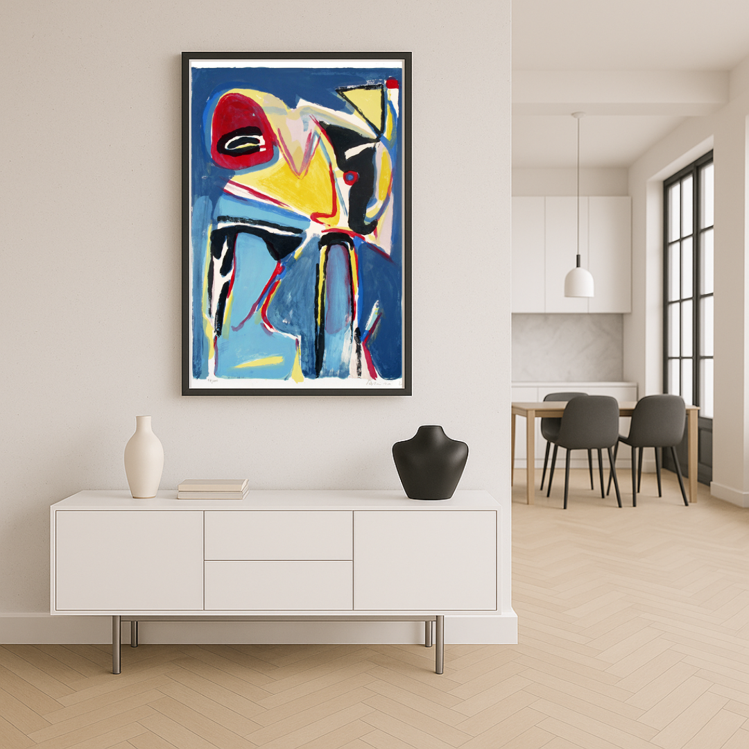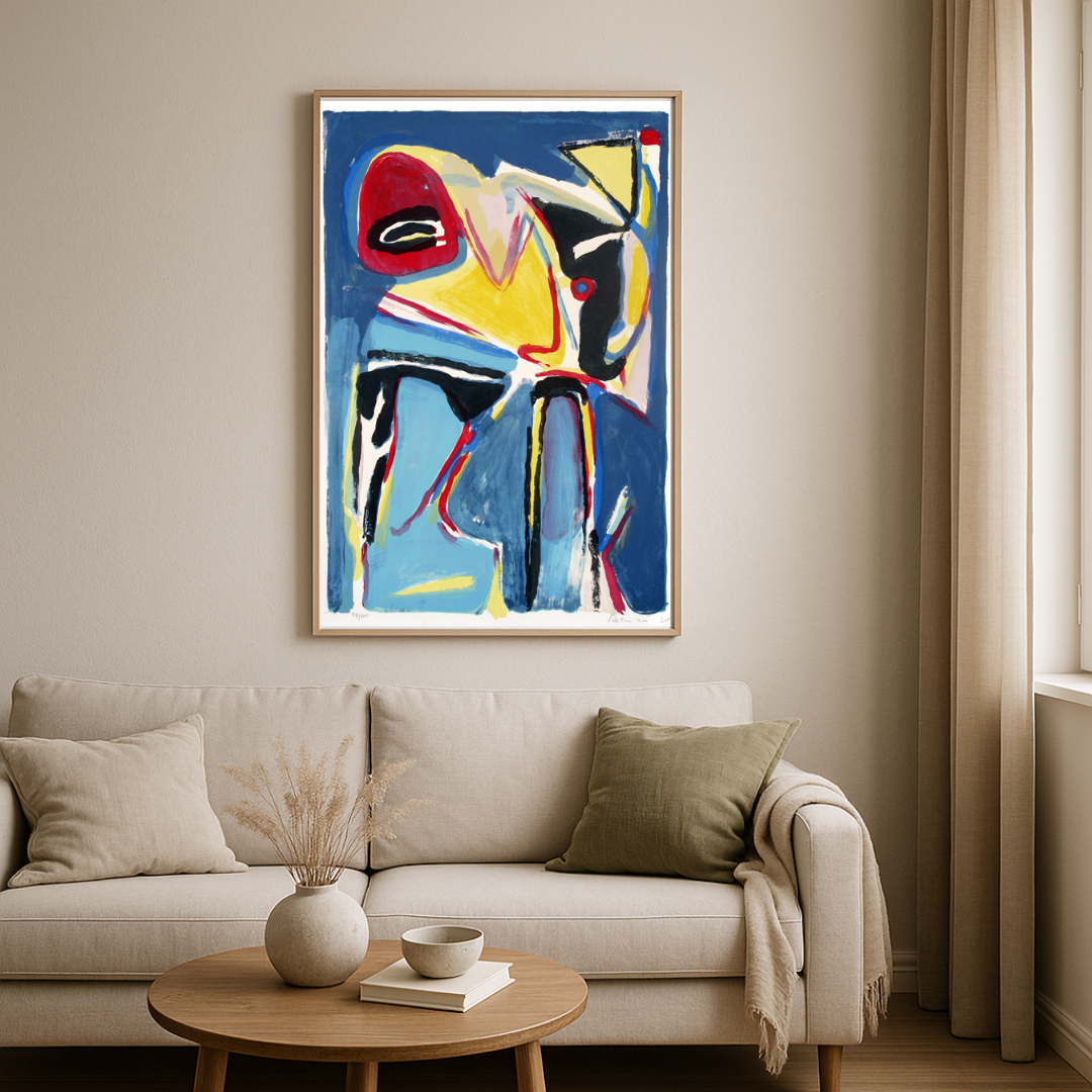À travers un vocabulaire formel proche de l’abstraction, Bram van Velde développe une peinture qui échappe aux catégories traditionnelles. L’équilibre de cette lithographie repose sur un jeu puissant de couleurs primaires – le rouge, le jaune et le bleu – associées à des zones sombres et des lignes noires qui scandent la composition. Loin de toute figuration, l’image impose une présence intense, presque dramatique, qui reflète la tension intérieure de l’artiste et sa quête de vérité picturale.