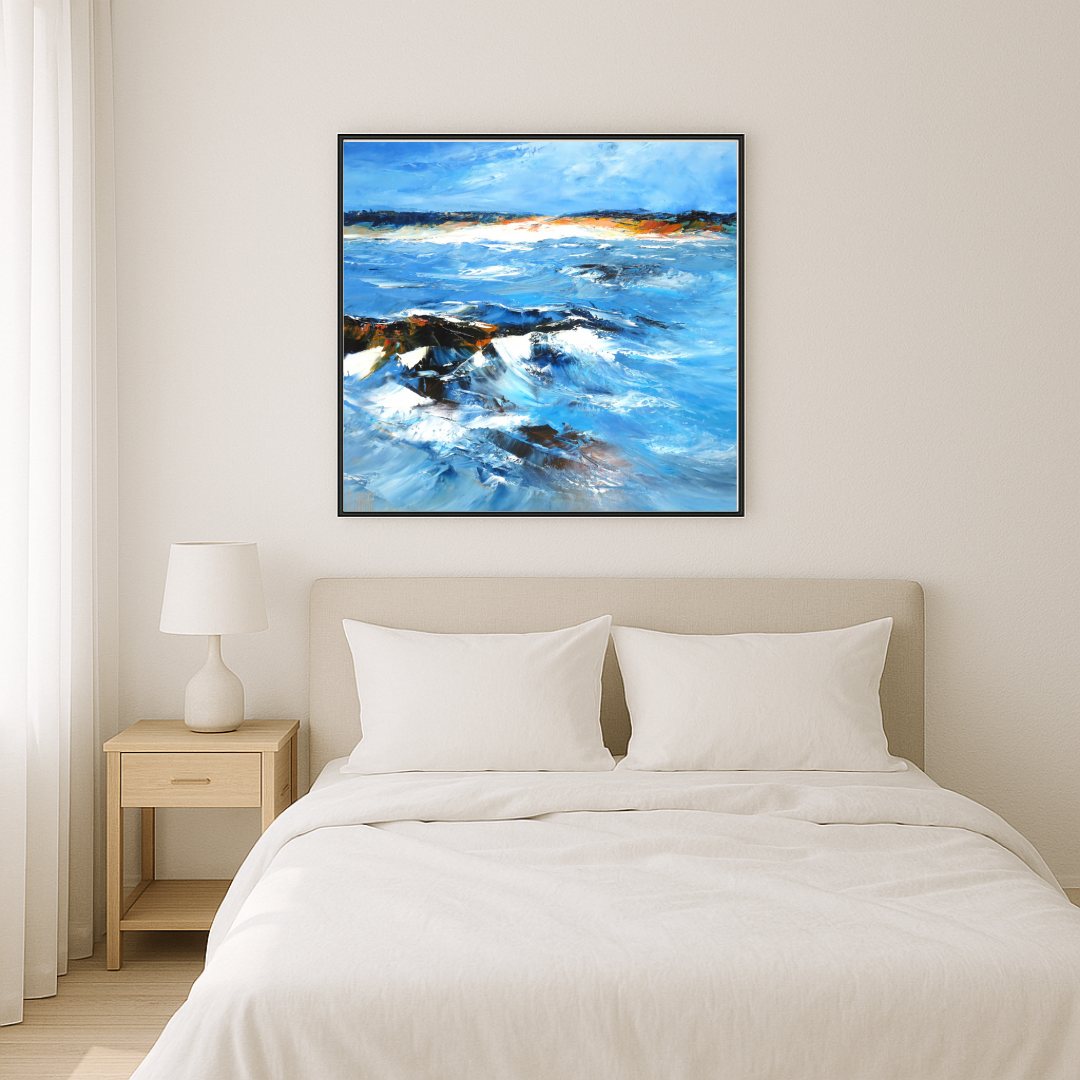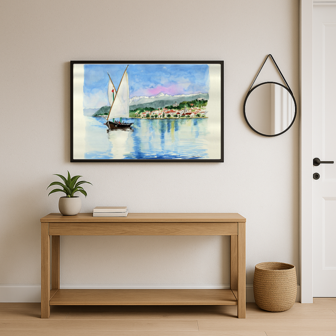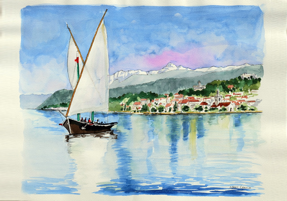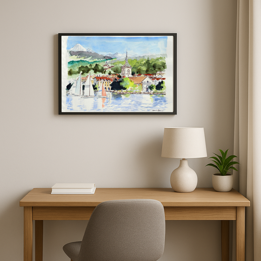 La maîtrise de l’aquarelle se traduit ici par la légèreté des transparences et la fluidité des lavis, qui confèrent à la composition une fraîcheur immédiate. Les nuances douces du ciel se fondent harmonieusement avec les teintes pastel des immeubles, créant une atmosphère équilibrée et apaisante. Chaque détail, du clocher aux reflets de l’eau, contribue à l’harmonie générale de l’œuvre et révèle le regard sensible de l’artiste.