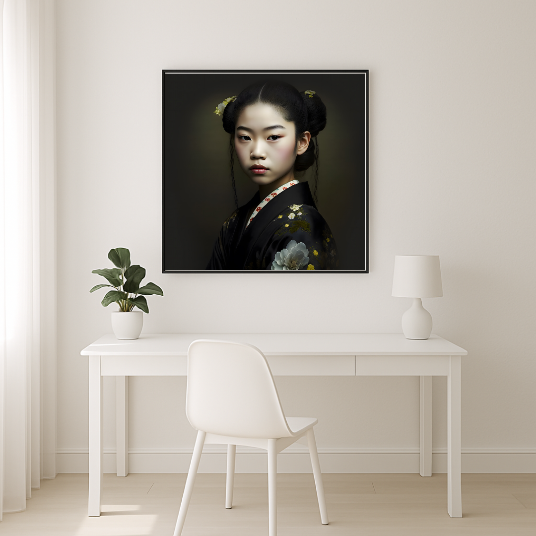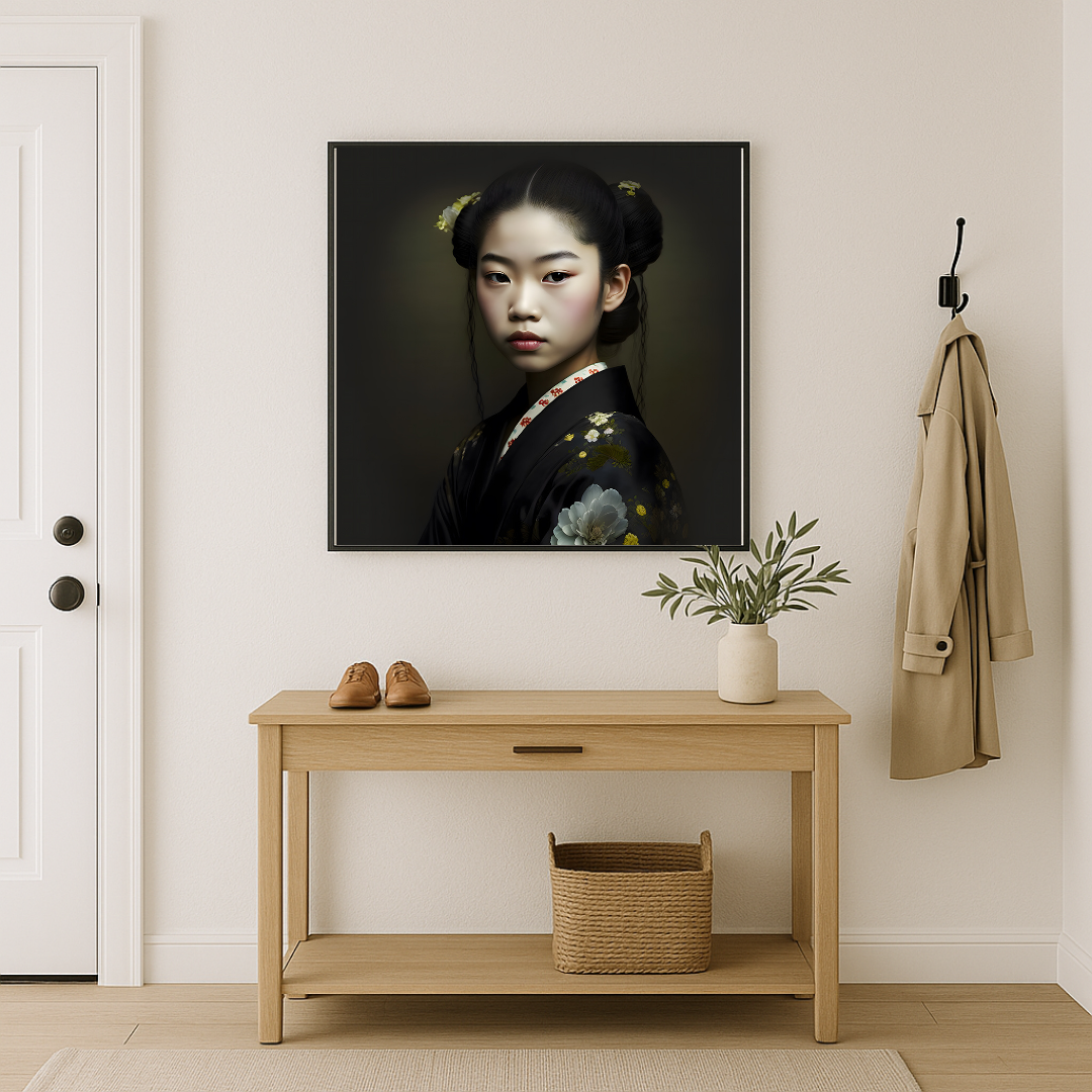 Le kimono sombre, orné de motifs floraux minutieusement travaillés, contraste avec la pureté du teint et la sobriété du fond, mettant en lumière la richesse des détails et l’élégance subtile de la composition. Chaque fleur brodée devient un écho visuel aux vertus de patience, de discipline et d’harmonie qui caractérisent l’univers des maikos.