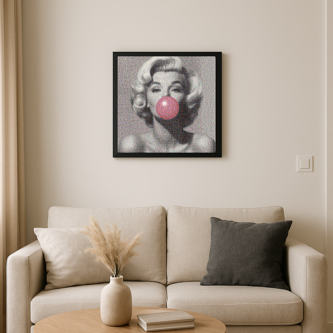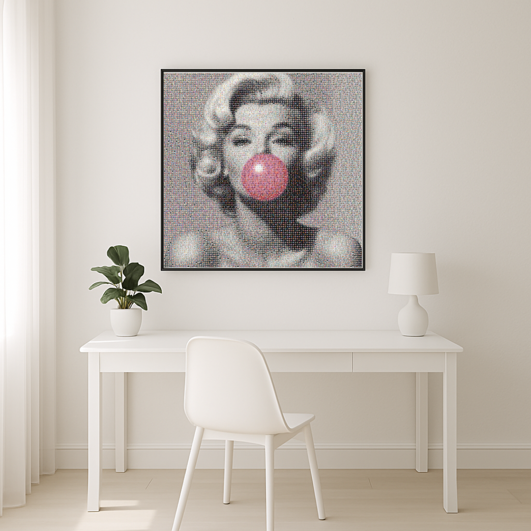 Disponible en 60×60 cm, 80×80 cm et 100×100 cm, Marilyn Bubble Mosaïc est livrée avec un cadre châssis rentrant qui souligne sa finesse et son raffinement. Véritable hommage à l’icône hollywoodienne, l’œuvre conjugue intemporalité et modernité dans une mosaïque vibrante et poétique.