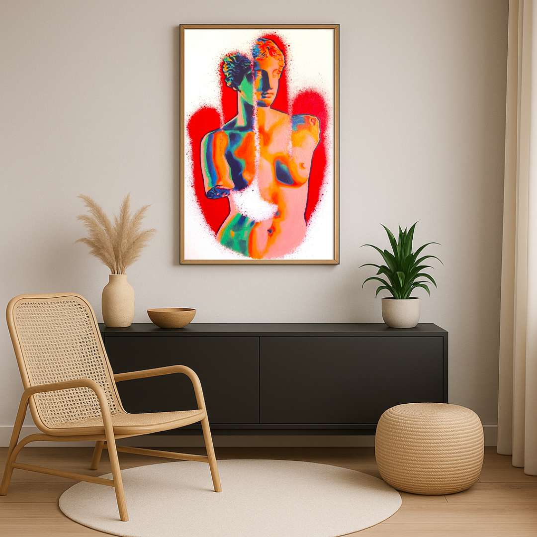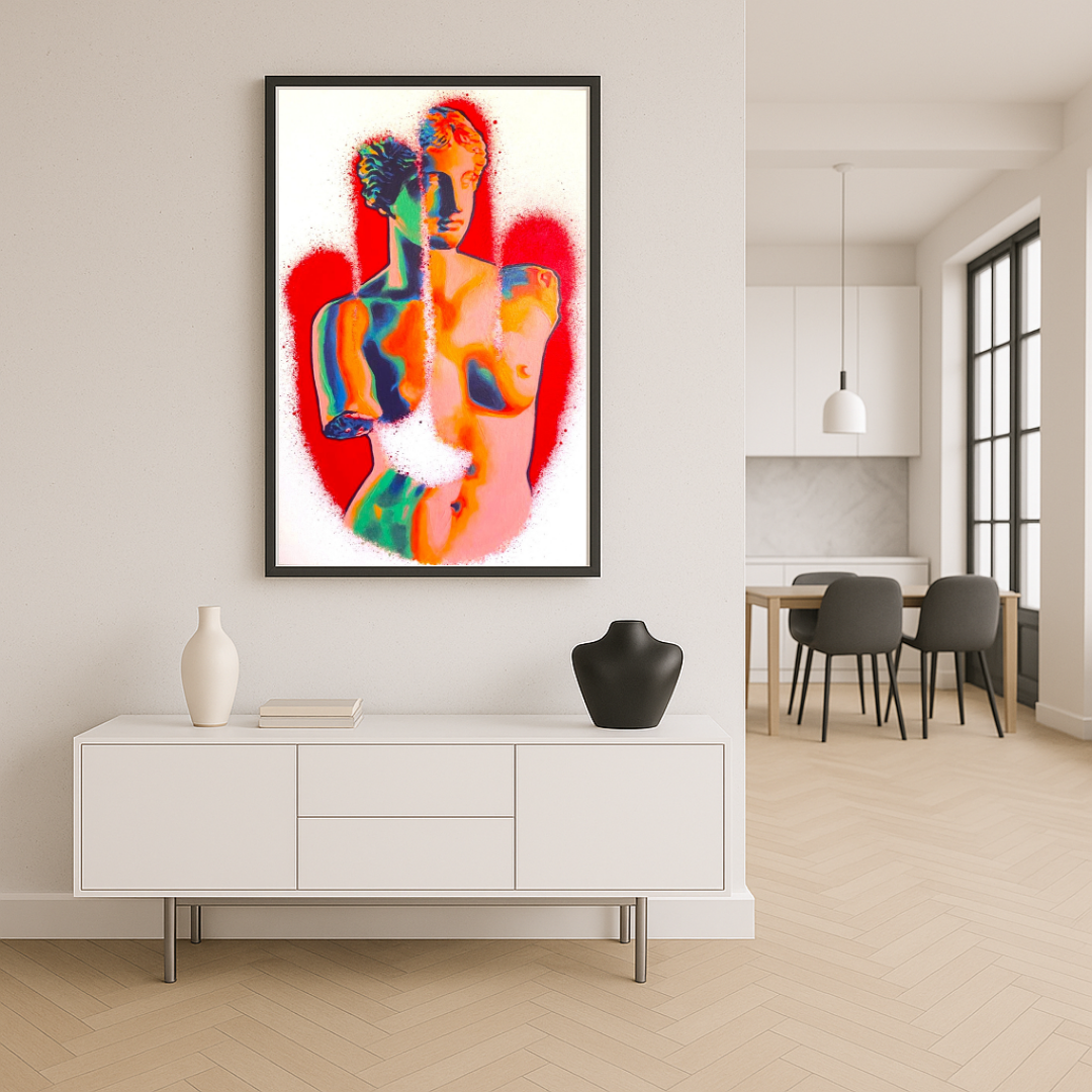 Dans cette pièce, Repy One revisite la célèbre Vénus de Milo avec une approche contemporaine et percutante. Le corps antique, magnifié par des teintes vives et saturées, est partiellement recouvert par l’empreinte d’une main, réalisée à la bombe dans un geste net et brut. Cette superposition entre l’héritage classique et l’expression urbaine interroge la place de l’art dans notre société actuelle : sacré ou profané, figé ou réinventé.