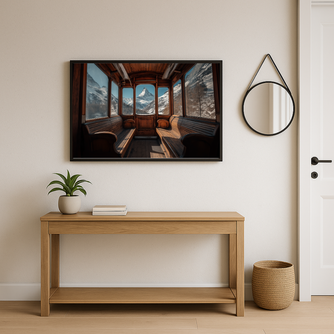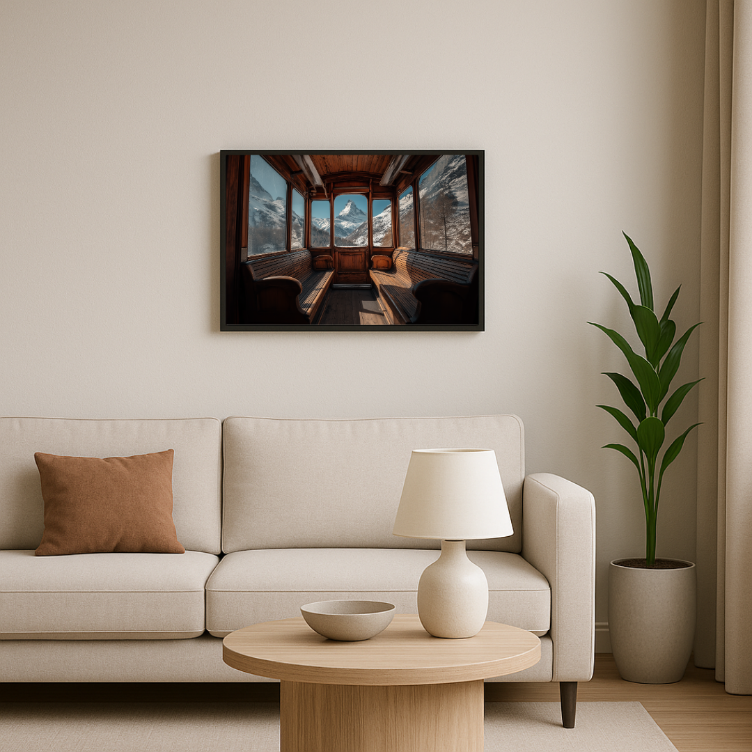 La composition nous invite à bord d’un ancien wagon en bois, dont les bancs patinés par le temps contrastent avec la majesté du paysage alpin. À travers les vitres, le regard est irrésistiblement attiré par le Cervin, montagne mythique qui domine l’horizon enneigé. Cette perspective centrale, cadrée comme une fenêtre sur l’infini, évoque à la fois l’évasion, le romantisme du voyage ferroviaire et la grandeur immuable de la nature. Le spectateur est placé dans la peau d’un voyageur, invité à s’asseoir et à contempler ce décor grandiose.