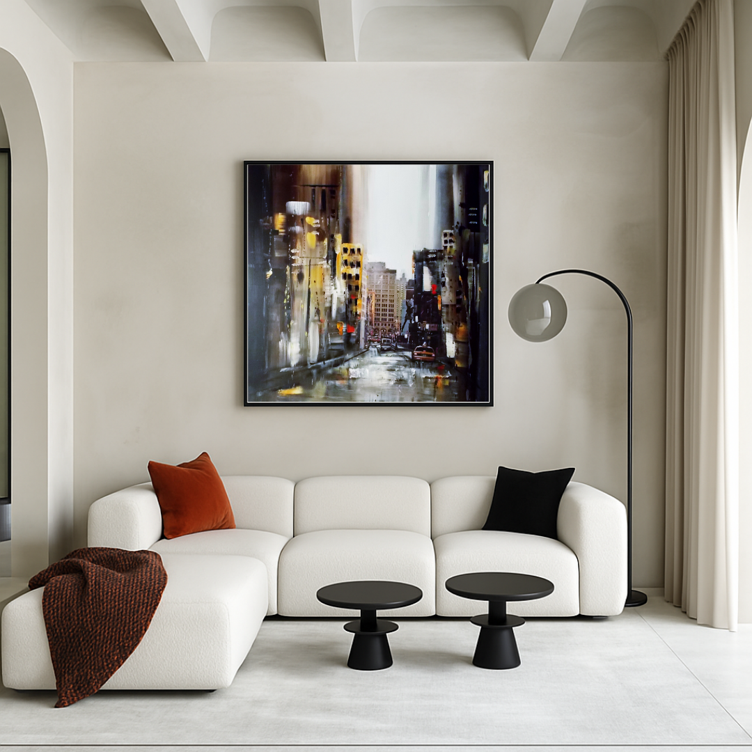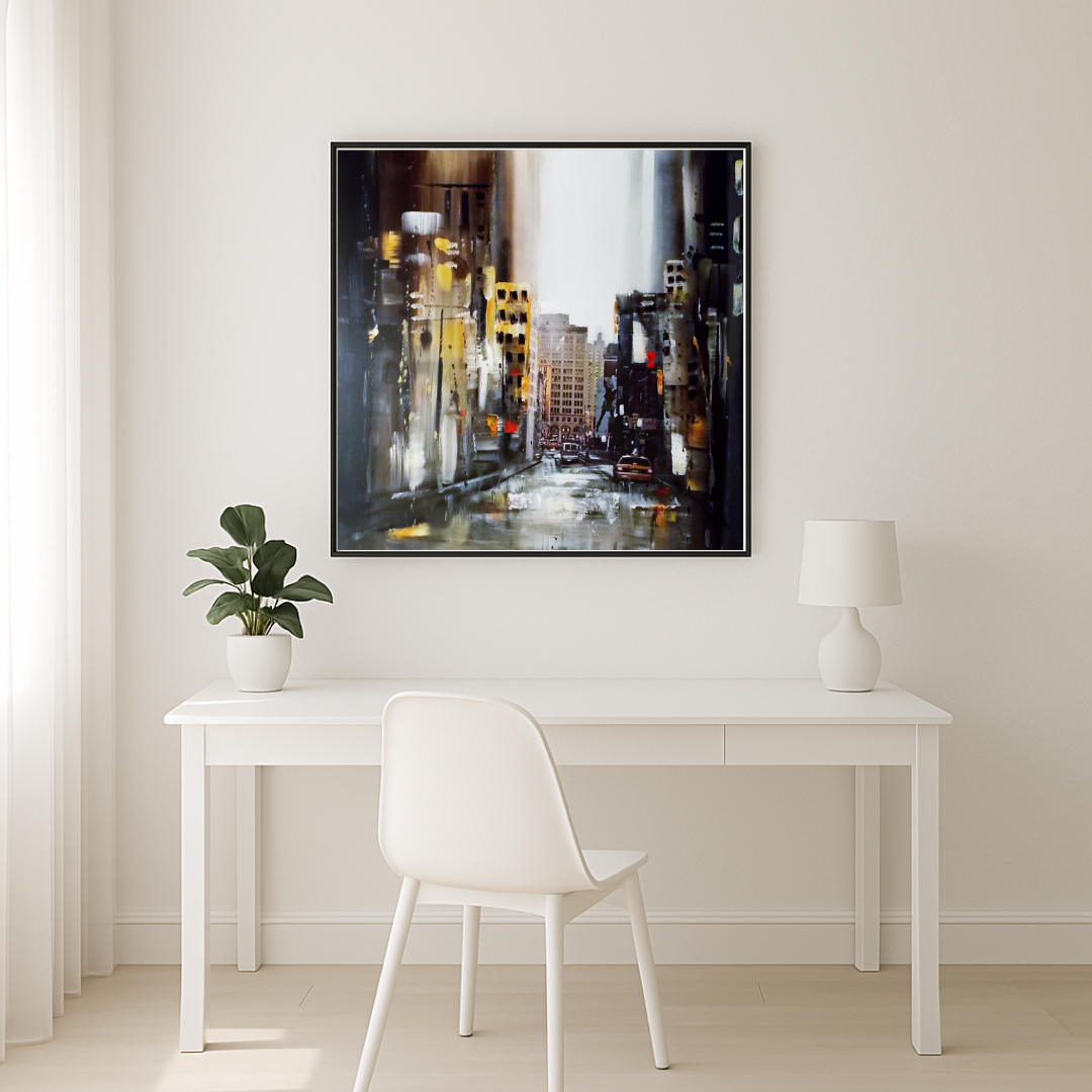 Ce tableau plonge le spectateur dans une ruelle urbaine baignée de lumière diffuse, où les gratte-ciel se fondent dans une brume dorée. Les reflets du sol mouillé, les lueurs tamisées et les formes suggérées créent une atmosphère presque cinématographique, entre rêve et réalité. L’artiste joue subtilement avec la texture et la transparence, laissant deviner les contours de la ville tout en renforçant l’impression d’un New York intemporel, à la fois mouvant et figé.