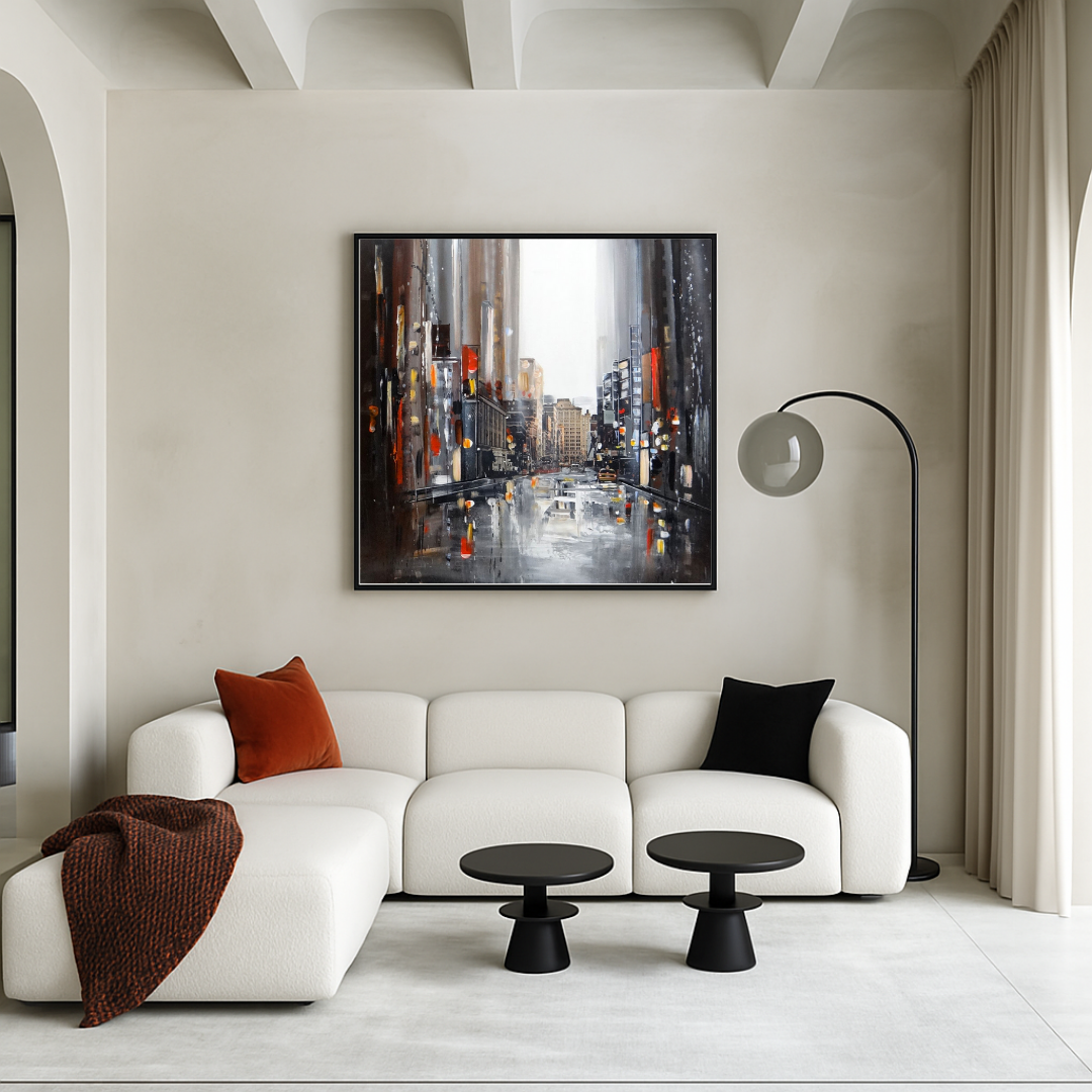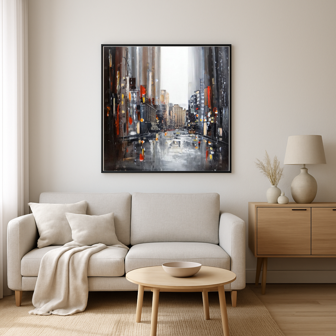 Cette composition urbaine enveloppe la ville d’un voile de mystère et de poésie. L’artiste capture ici l’atmosphère d’un New York pluvieux, où les buildings s’étirent en reflets vertigineux et les flaques de lumière transforment la chaussée en miroir mouvant.