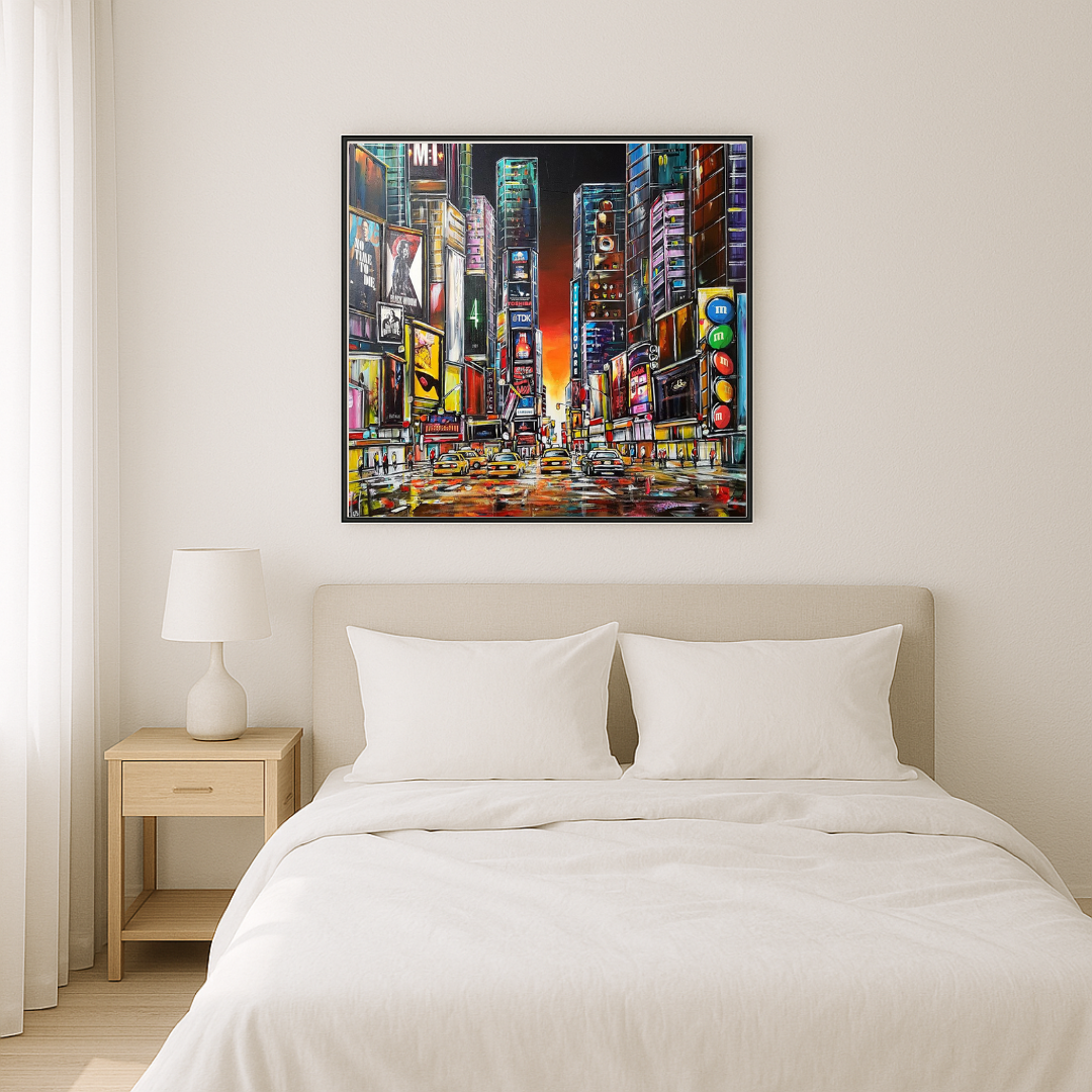 Plongée visuelle au cœur de Times Square, cette scène urbaine nocturne capte l’énergie bouillonnante de New York avec une intensité saisissante. Entre taxis jaunes, gratte-ciels illuminés et néons multicolores, l’artiste restitue l’âme vibrante de la ville qui ne dort jamais, dans une composition foisonnante de détails.