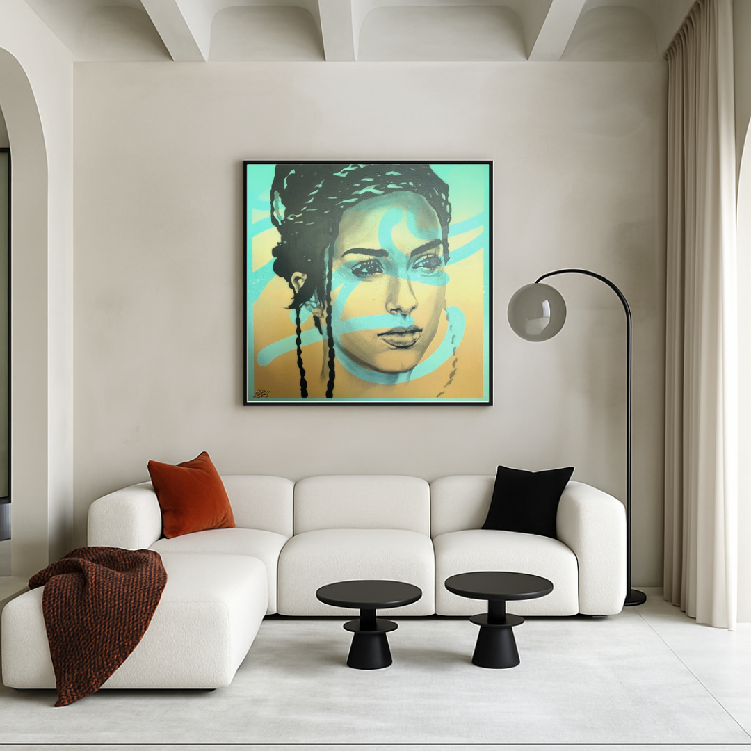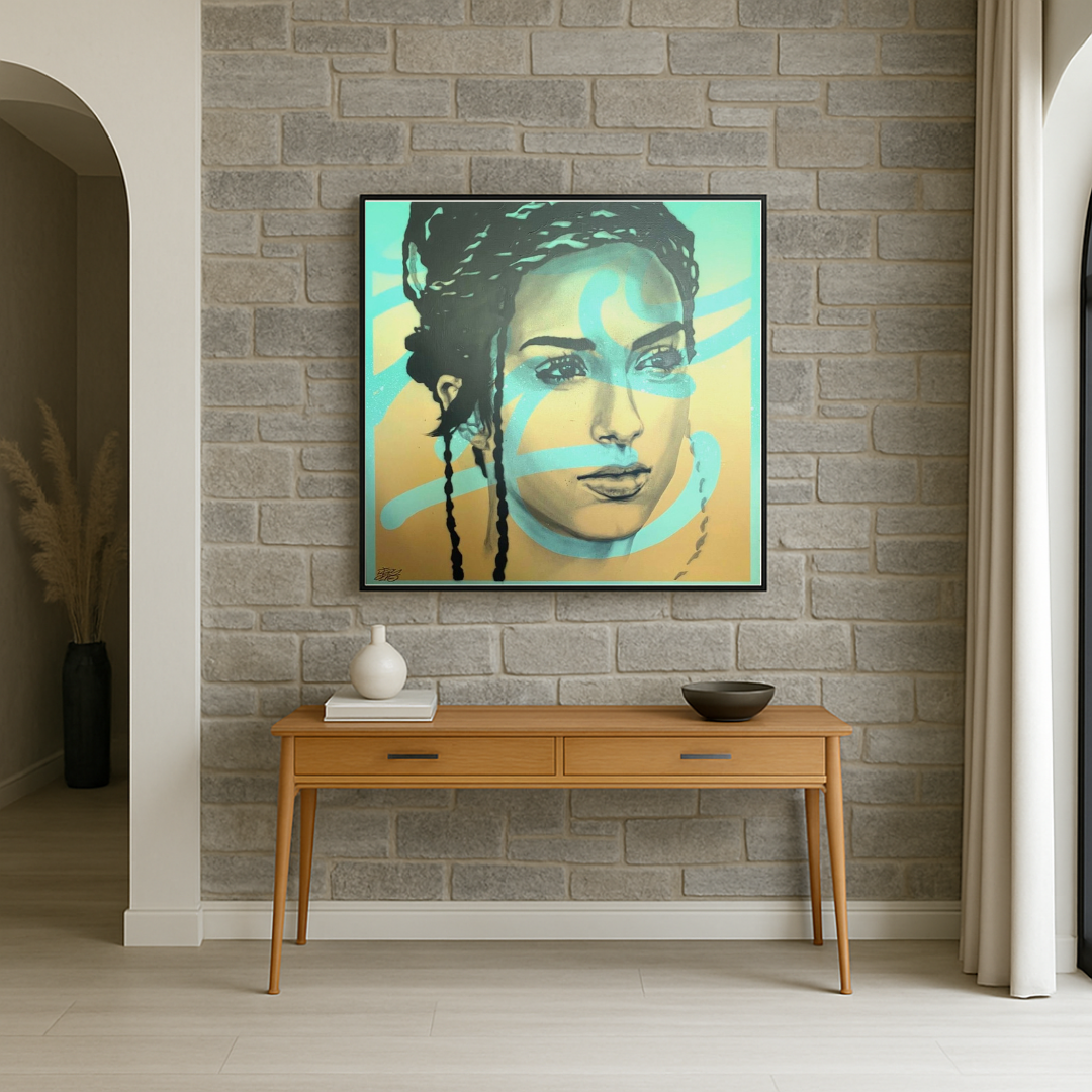 Ce portrait féminin se distingue par la finesse du trait et la force du regard, subtilement traversé par des arabesques bleu ciel, signature gestuelle propre à Repy One. L’artiste superpose des couches visuelles et émotionnelles, entre réalisme du visage et abstraction calligraphique, créant ainsi une tension poétique entre intimité et expression urbaine.