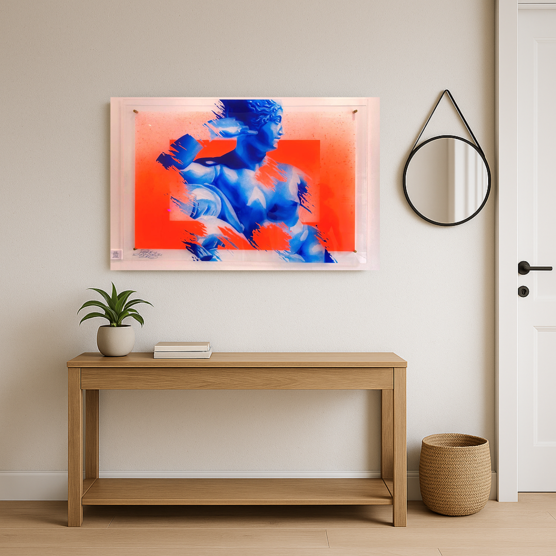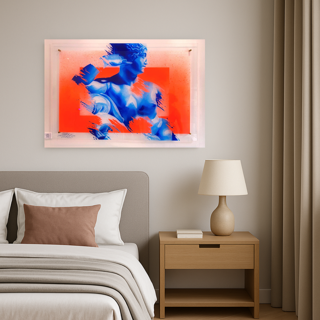 Repy One revisite ici l’esthétique classique d’une sculpture antique à travers un traitement chromatique audacieux : un bleu profond sculpté à la bombe sur fond orange éclatant, saturé d’énergie. Les éclaboussures dynamiques viennent rompre la perfection formelle de la figure, comme une vibration contemporaine qui traverse le marbre figé.