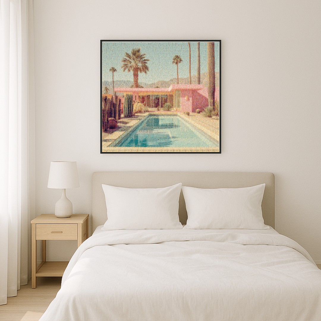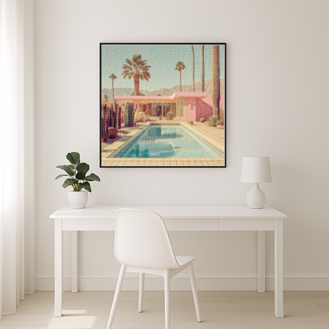 La force de la composition réside dans sa mosaïque de plus de 10 000 vignettes, qui, assemblées avec minutie, forment l’image d’une villa aux murs roses pastel, bordée de cactus et de palmiers, avec une piscine scintillante au premier plan. De loin, l’ensemble évoque un paysage solaire, symbole de détente et de rêve américain. En s’approchant, on découvre la multitude de micro-images qui composent la scène, offrant un second niveau de lecture riche en détails et en émotions.
