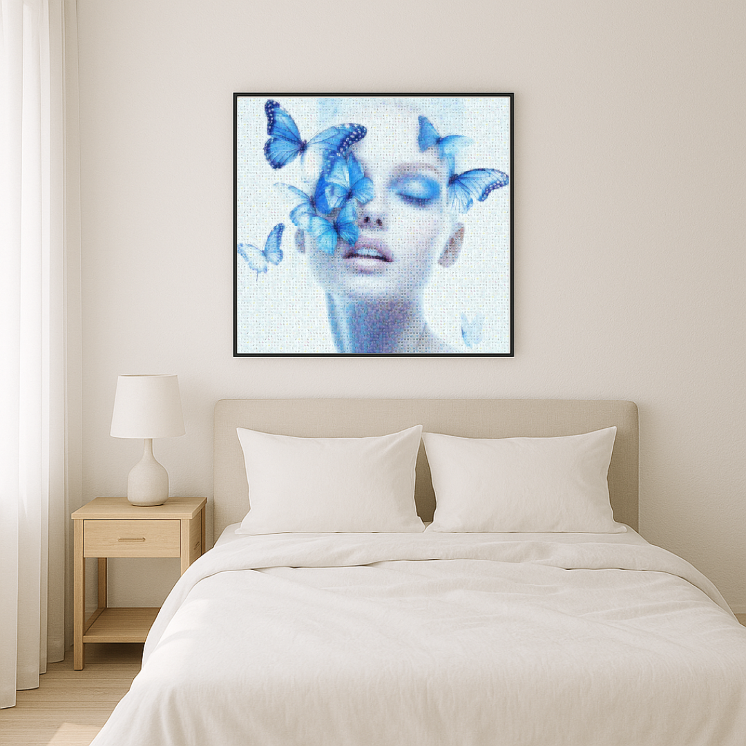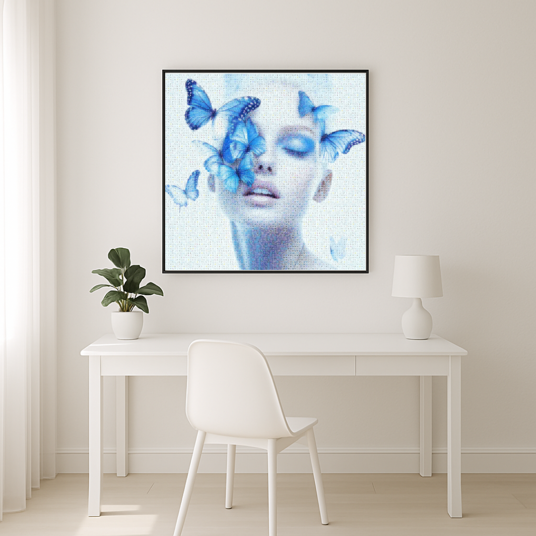 L’originalité de cette création repose sur sa mosaïque de plus de 10 000 vignettes. De loin, le spectateur contemple le visage d’une femme au regard apaisé, entourée de papillons bleus qui semblent flotter avec légèreté dans un univers éthéré. De près, l’image se fragmente pour révéler la richesse des micro-compositions qui la constituent, multipliant les niveaux de lecture et offrant une expérience visuelle immersive. Cette double perception – vision globale et découverte des détails – reflète la démarche de Novarino : unir mémoire collective, raffinement esthétique et technologie contemporaine.