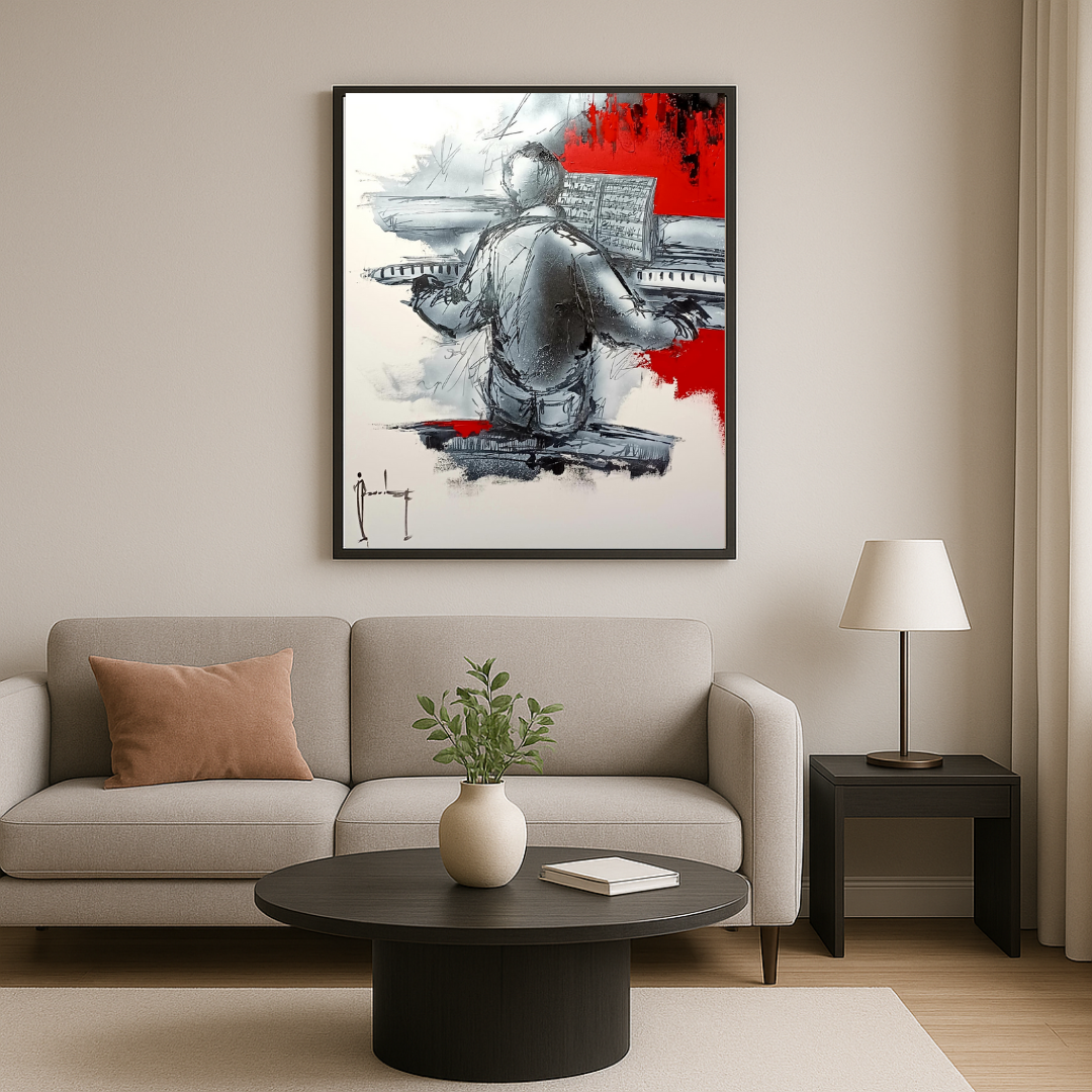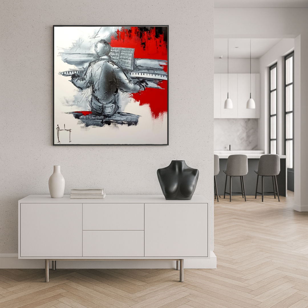 La palette monochrome, dominée par le noir et le gris, est dynamisée par des éclats de rouge flamboyant qui apportent intensité et modernité à l’ensemble. Chaque coup de couteau, chaque trait esquissé, restitue le rythme de la musique et l’émotion de l’instant. L’œuvre séduit autant par son minimalisme graphique que par sa profondeur dramatique.